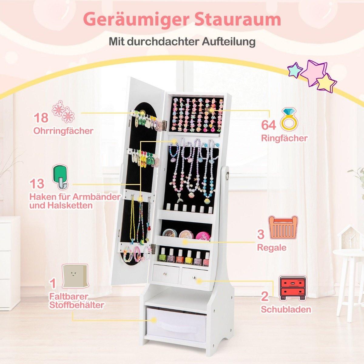 Arricchisci la cameretta del tuo bambino con un mobiletto portagioielli con specchio a figura intera, che offre un look elegante e uno spazio di archiviazione organizzato. Questa soluzione 2 in 1 combina uno specchio ad alta risoluzione con ampio spazio per i gioielli.
