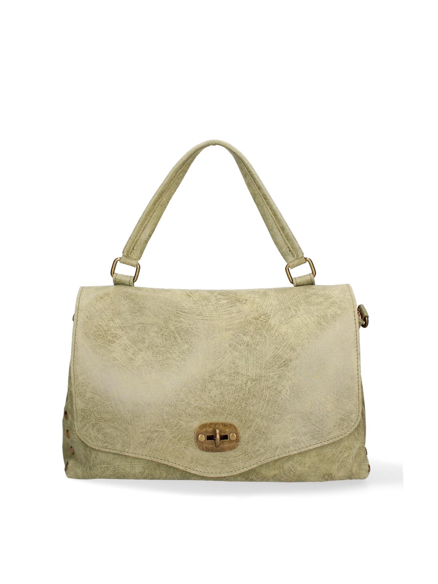 Questa borsa a mano presenta un design classico con un tocco moderno, rendendola un accessorio versatile per varie occasioni. La borsa è adornata con borchie metalliche lungo i lati, aggiungendo un tocco di sofisticazione audace al suo aspetto generale. È dotata di una robusta maniglia superiore per un trasporto confortevole e di una chiusura a girello sicura sulla patta anteriore per tenere al sicuro gli effetti personali.