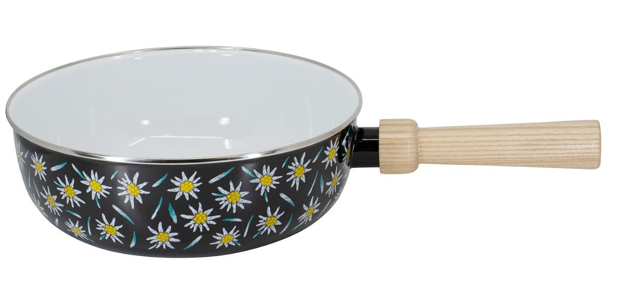Padella in smalto compatibile con induzione per fonduta di formaggio e altri piatti, con elegante manico in legno.