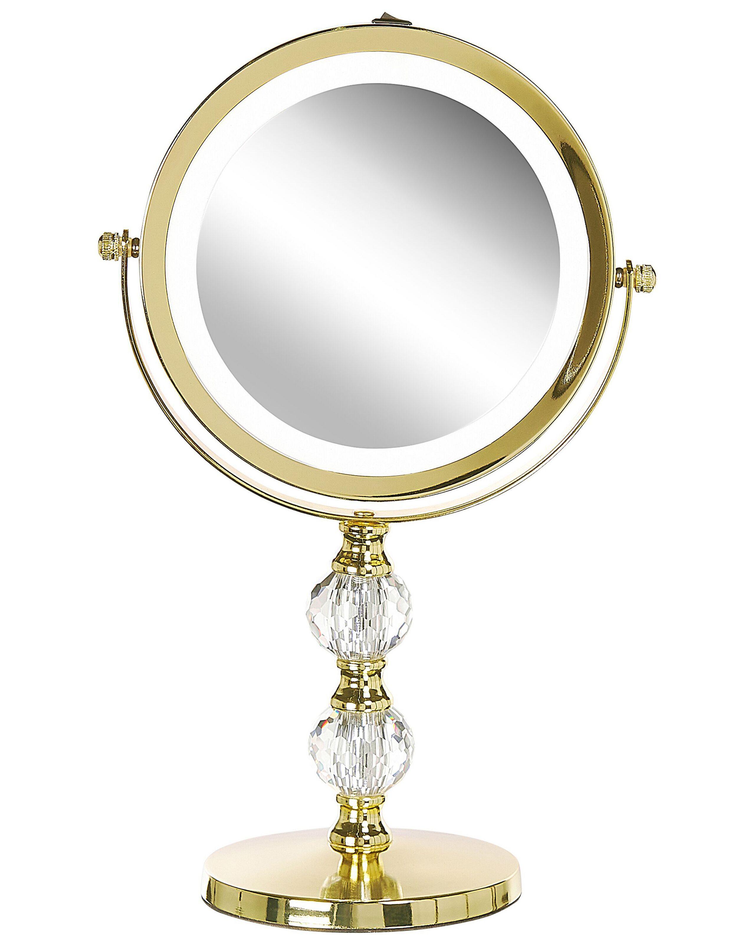 Specchio da tavolo make up con luci LED. Questo specchio per trucco è una vera gemma, sia pratico che decorativo, si adatta perfettamente a qualsiasi ambiente glamour grazie alla sua cornice decorata. Realizzato in ferro resistente con finitura lucida, è doppio: offre sia un riflesso standard che uno con ingrandimento 5x. Lo specchio è dotato di una luce LED integrata, particolarmente utile durante l'applicazione del trucco, garantendo precisione e comfort. Un complemento elegante che combina funzionalità e stile.