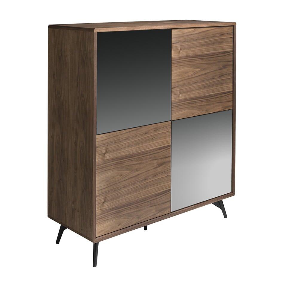 Credenza alta dal design moderno con struttura in legno impiallacciato in noce naturale e gambe originali in acciaio inox verniciato con polveri epossidiche nere. L'originale dettaglio in vetro nero effetto specchio aggiunge un perfetto tocco di stile al vostro salotto. Dispone di un ampio spazio contenitivo con 4 ante con sistema di apertura push and pull e chiusura ammortizzata.