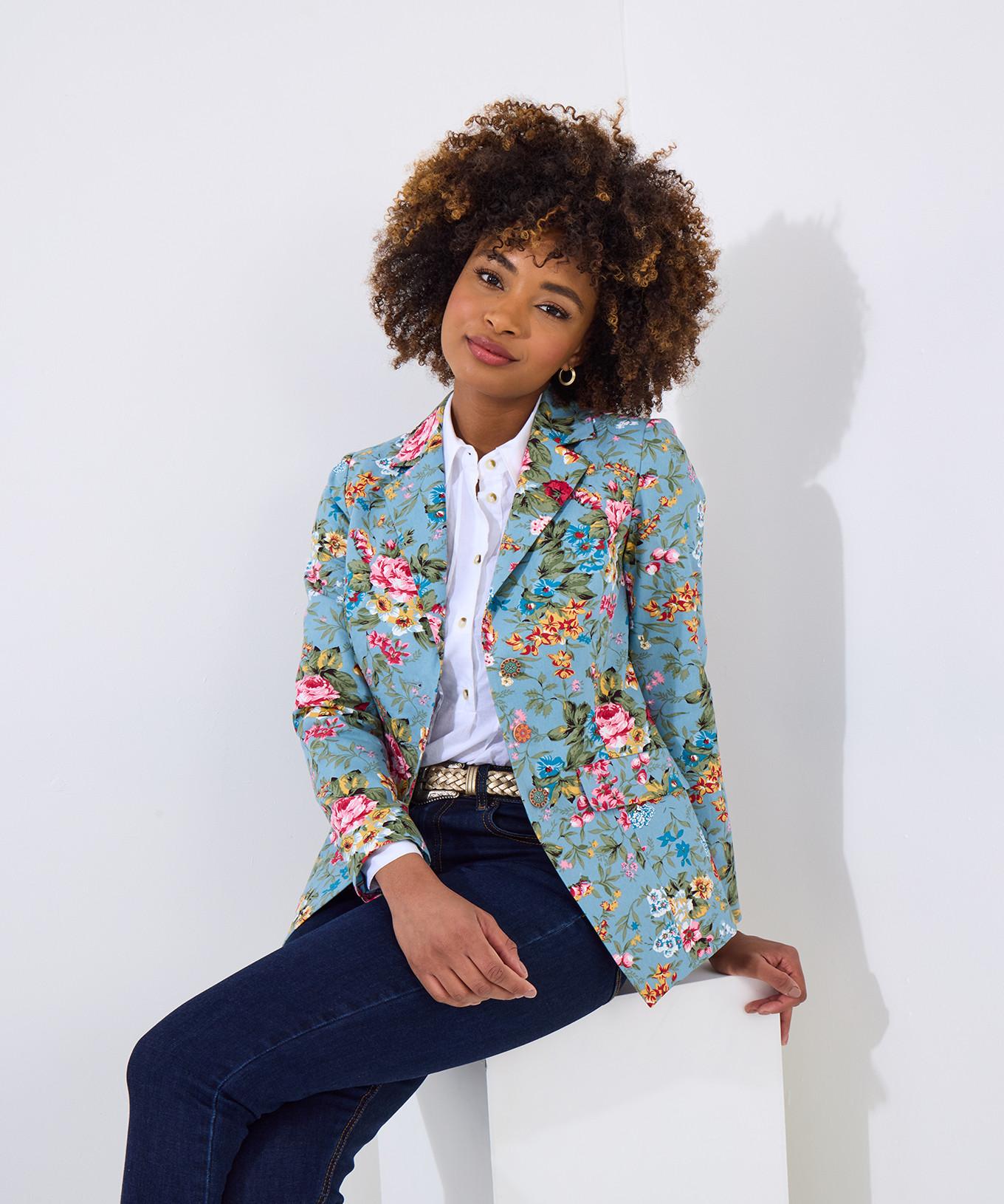 Questa giacca in cotone presenta una vivace stampa floreale, offrendo un look elegante e accattivante. Il design include un classico colletto a revers e una chiusura a due bottoni, che crea una silhouette raffinata. È un capo versatile che può valorizzare diversi outfit.