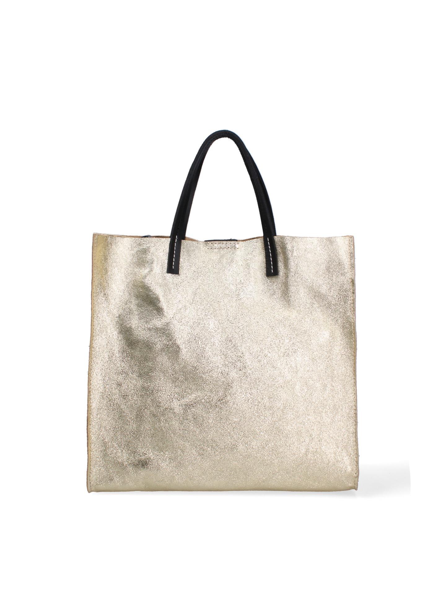 Questa borsa a tracolla, realizzata in Italia, presenta una finitura metallica scintillante, offrendo un accessorio elegante per varie occasioni. Il design include robusti manici neri, che offrono un'opzione di trasporto confortevole. Il suo interno spazioso consente di riporre comodamente gli oggetti essenziali di tutti i giorni.