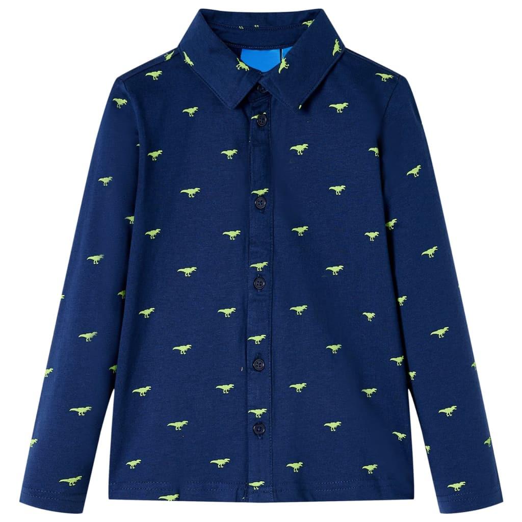 Questa camicia per bambini ha maniche lunghe, colletto a punta, e si chiude con una fila di bottoni. La camicia per bambini presenta le stampe ripetute di un dinosauro. La camicia per bambini è realizzata al 100% in cotone per offrire comfort e traspirabilità.