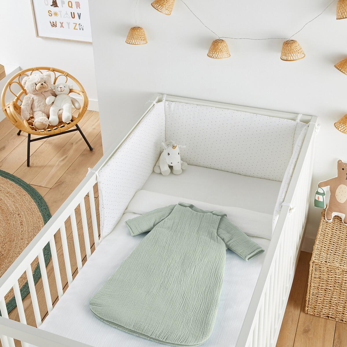 Il sacco nanna Kumla in garza di cotone è ideale per la mezza stagione, sostituendo la coperta e mantenendo il bambino al caldo durante il sonno. Le sue maniche lunghe sono rimovibili con bottoni a pressione per adattarsi alle diverse temperature.