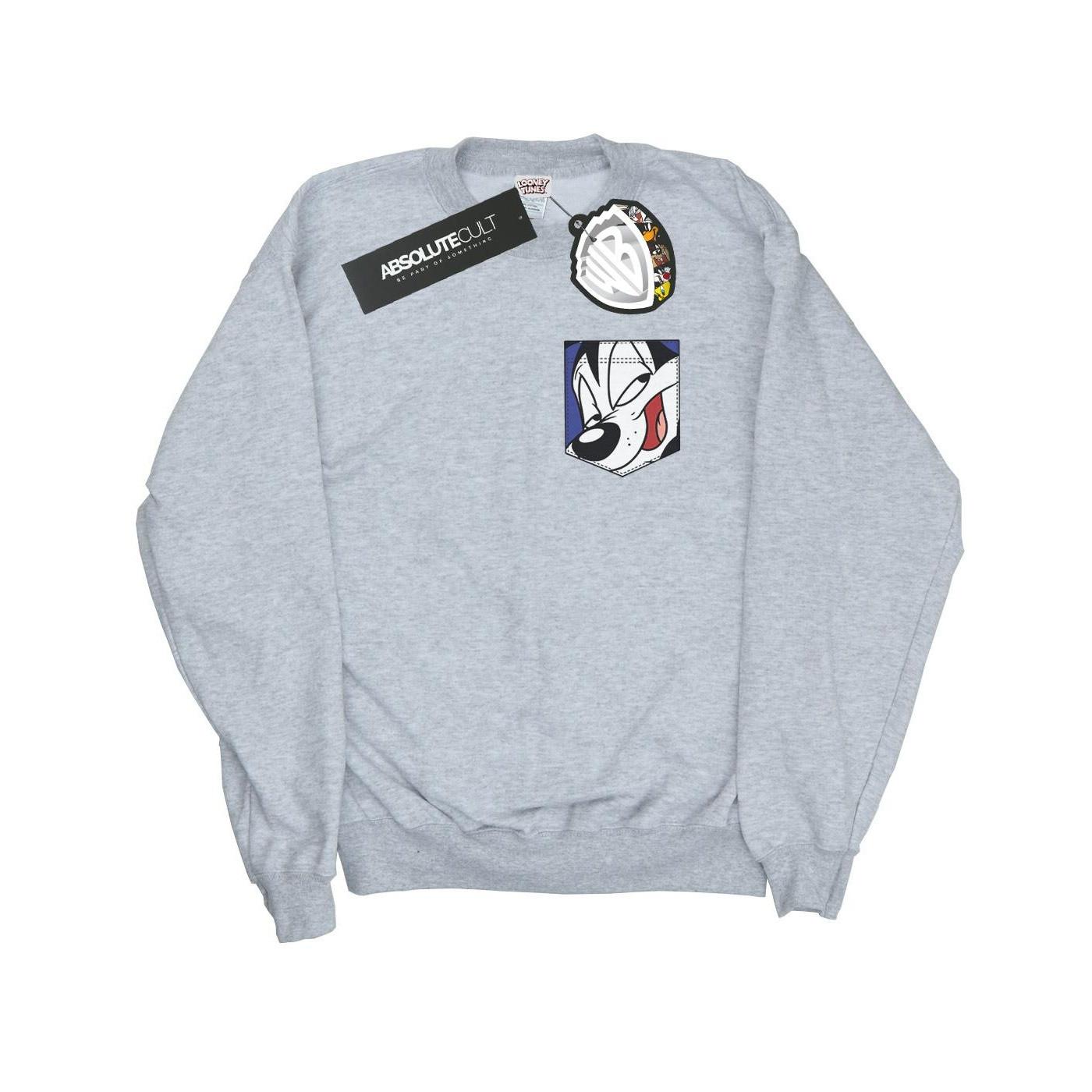 Questa felpa presenta un design divertente con Pepe Le Pew che sbircia da una finta tasca. È un'aggiunta comoda ed elegante a qualsiasi guardaroba casual, perfetta per i fan dei cartoni animati classici.