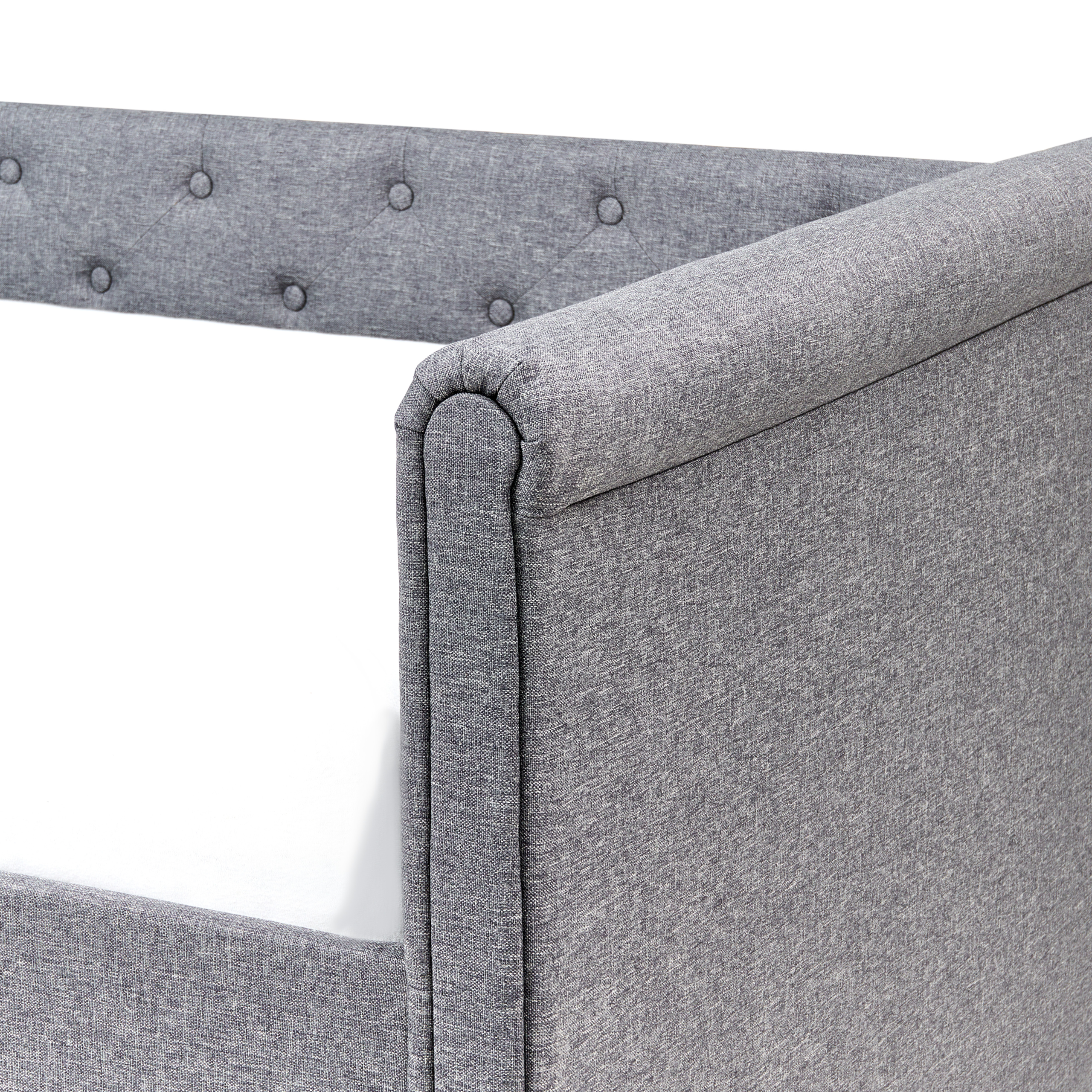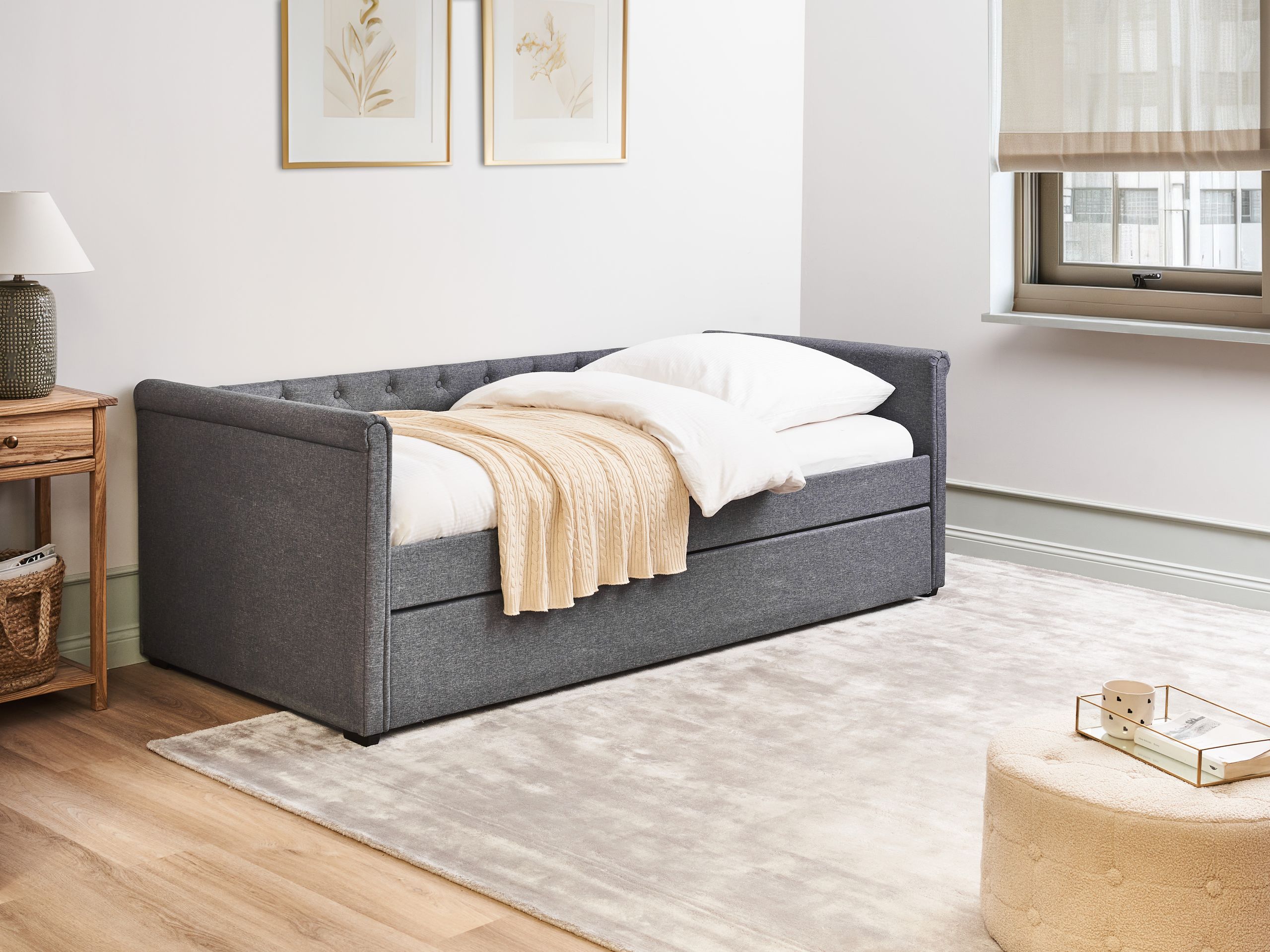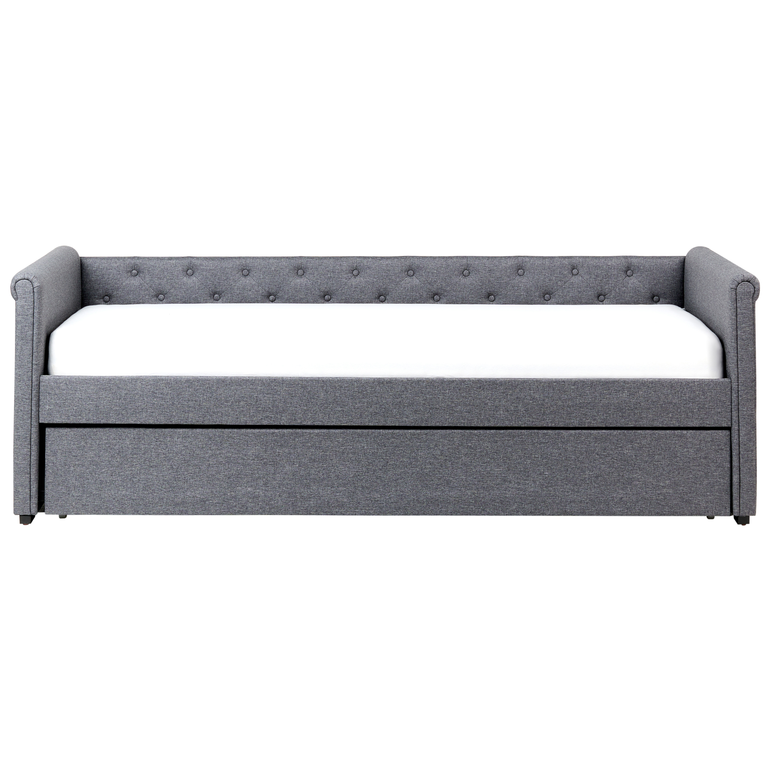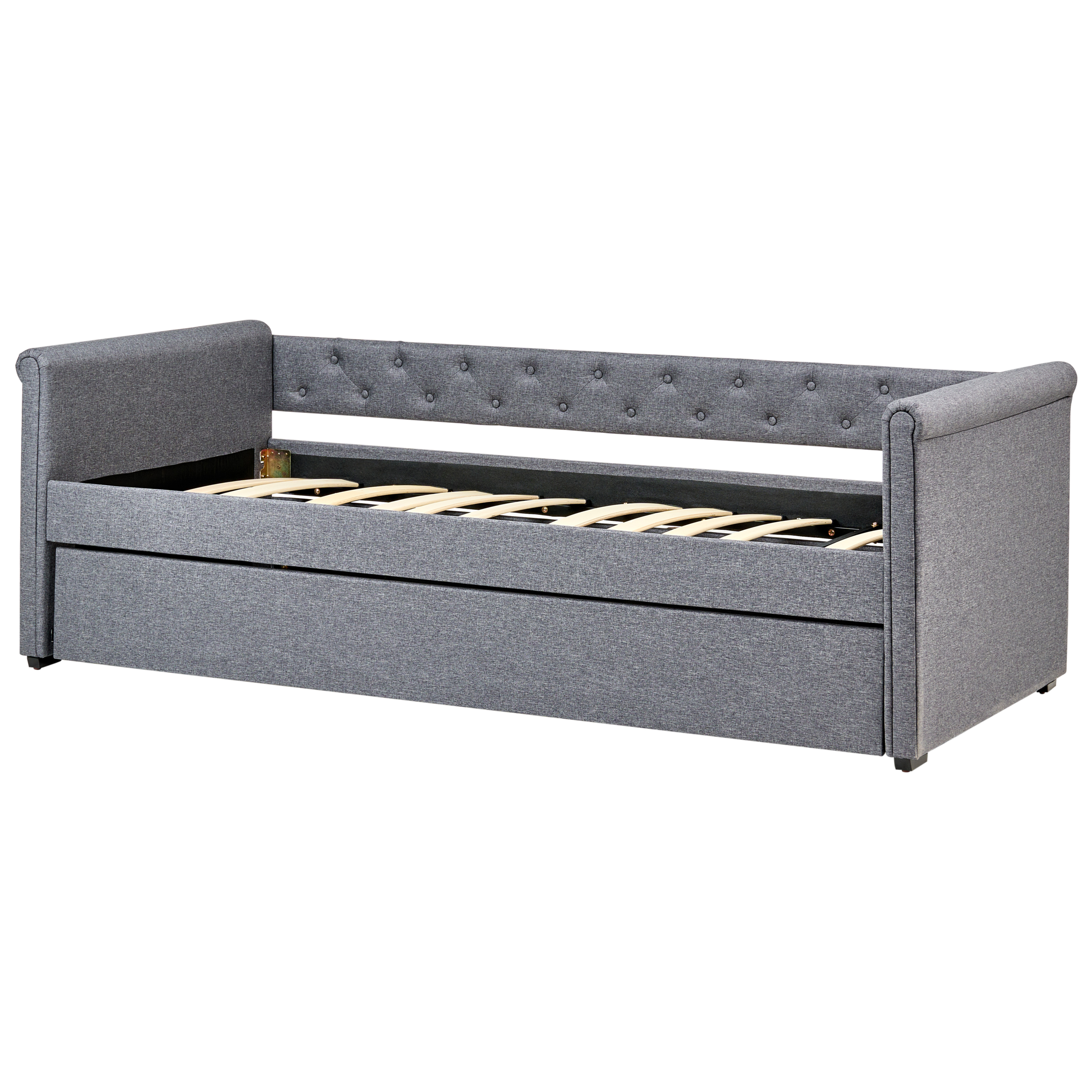 Letto singolo con letto estraibile. Questo letto con rete a doghe dall'iconico design Chesterfield, unisce stile e funzionalità. Realizzato in soffice tessuto di altissima qualità, presenta una solida struttura pensata per un riposo ottimale e una distribuzione del peso uniforme. I bottoni decorativi ne fanno un arredo perfetto per interni in stile retrò o tradizionale.