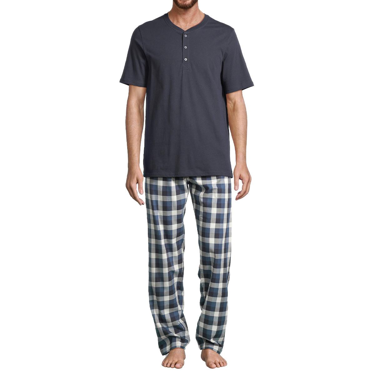 Questo pigiama offre comfort per rilassarsi a casa. Il set include un top a maniche corte con scollo Henley e pantaloni lunghi con un classico motivo a quadri.