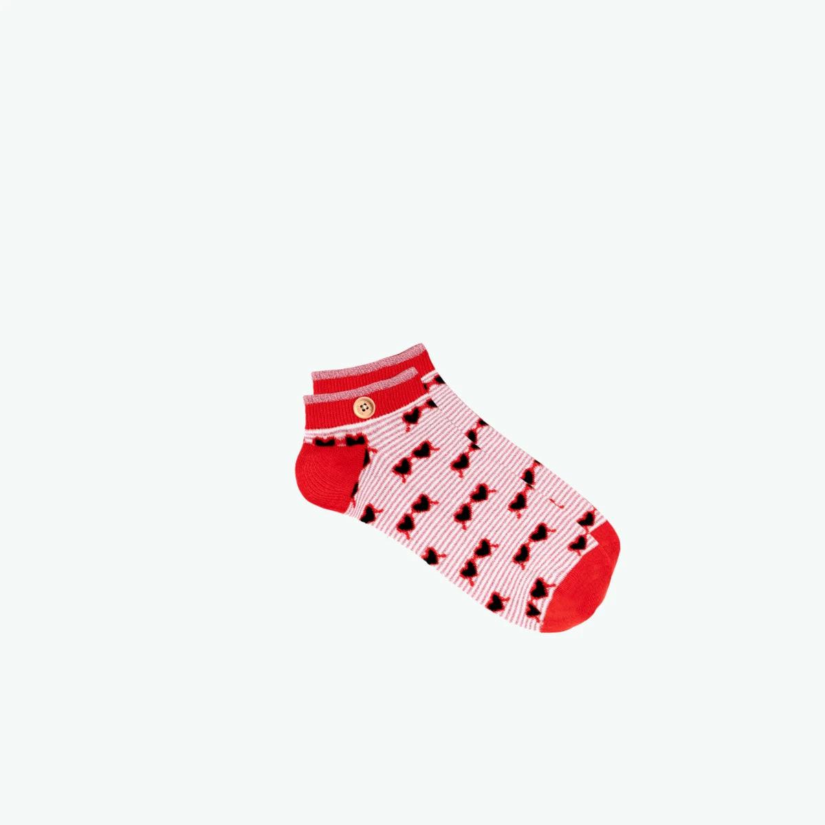 I dettagli di questi calzini sono attentamente studiati per offrire un comfort ottimale: un calzino unico, a righe rosse e bianche, decorato con cuori neri, accompagna i piedi per tutto il giorno. Le suole sono rinforzate per una durata ottimale, mentre la punta e il tallone sono rossi per un tocco di colore. Un piccolo bottone sul lato aggiunge un tocco di raffinatezza a questi calzini.