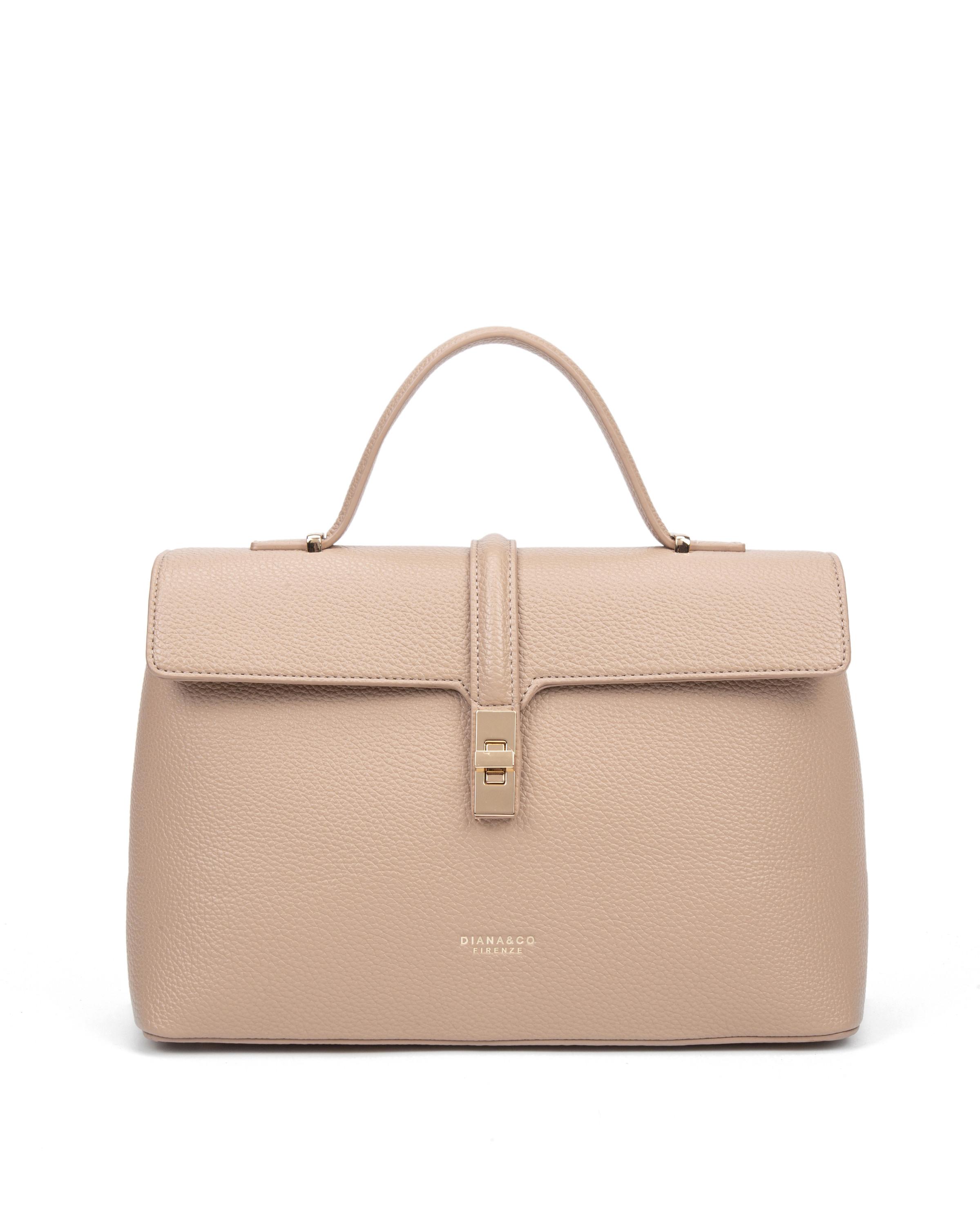 Questa elegante borsa a mano presenta un design strutturato con un manico superiore e una chiusura a patta sicura. La parte anteriore è adornata con un sottile logo del marchio, aggiungendo un tocco di raffinatezza. Il suo stile versatile la rende adatta a varie occasioni, dall'uso quotidiano agli eventi più formali.