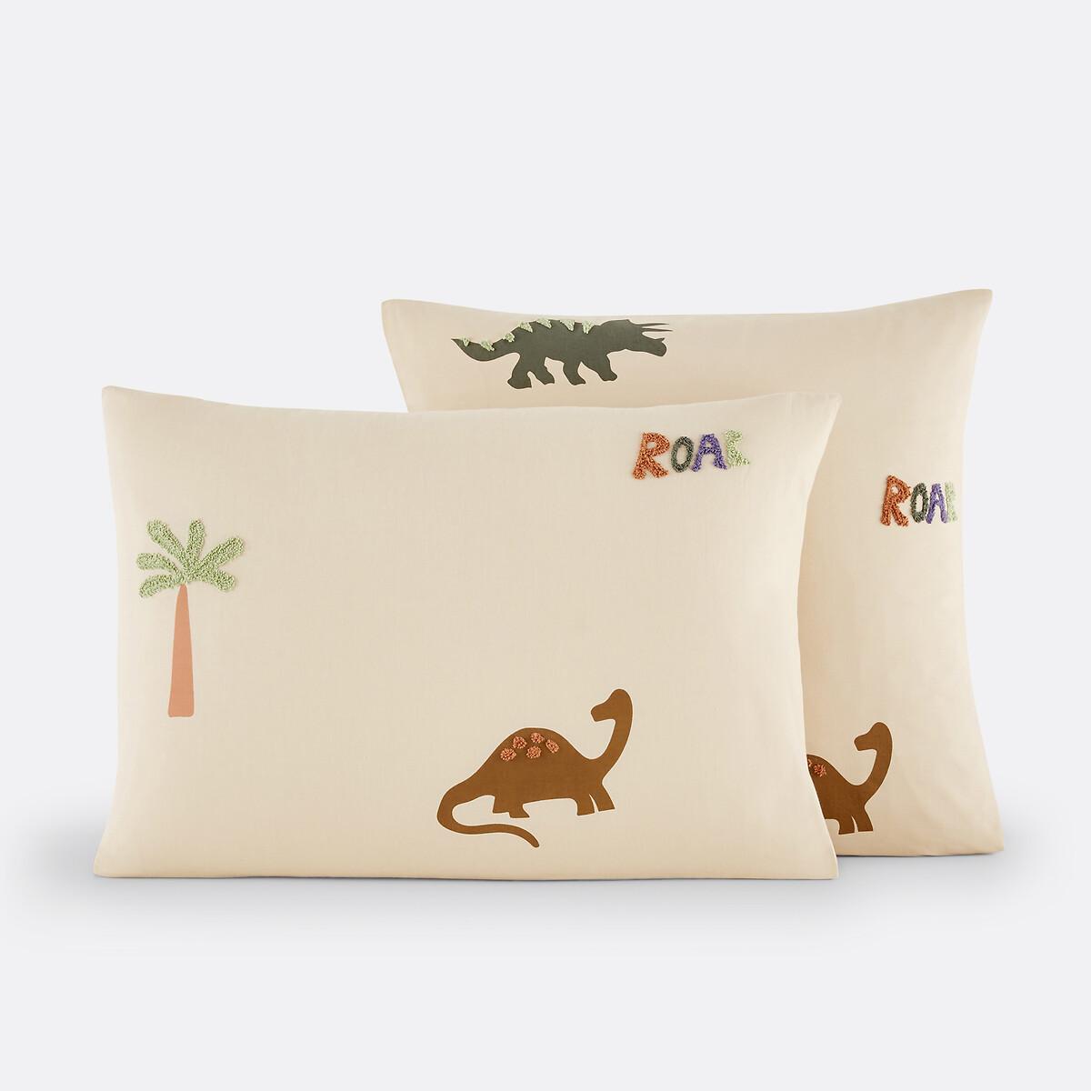 La fodera per cuscino Alto è realizzata con una miscela di 50% cotone riciclato, offrendo una scelta sostenibile per qualsiasi camera da letto. Presenta giocosi motivi di dinosauri e palme, aggiungendo un tocco di fantasia e avventura all'arredamento.