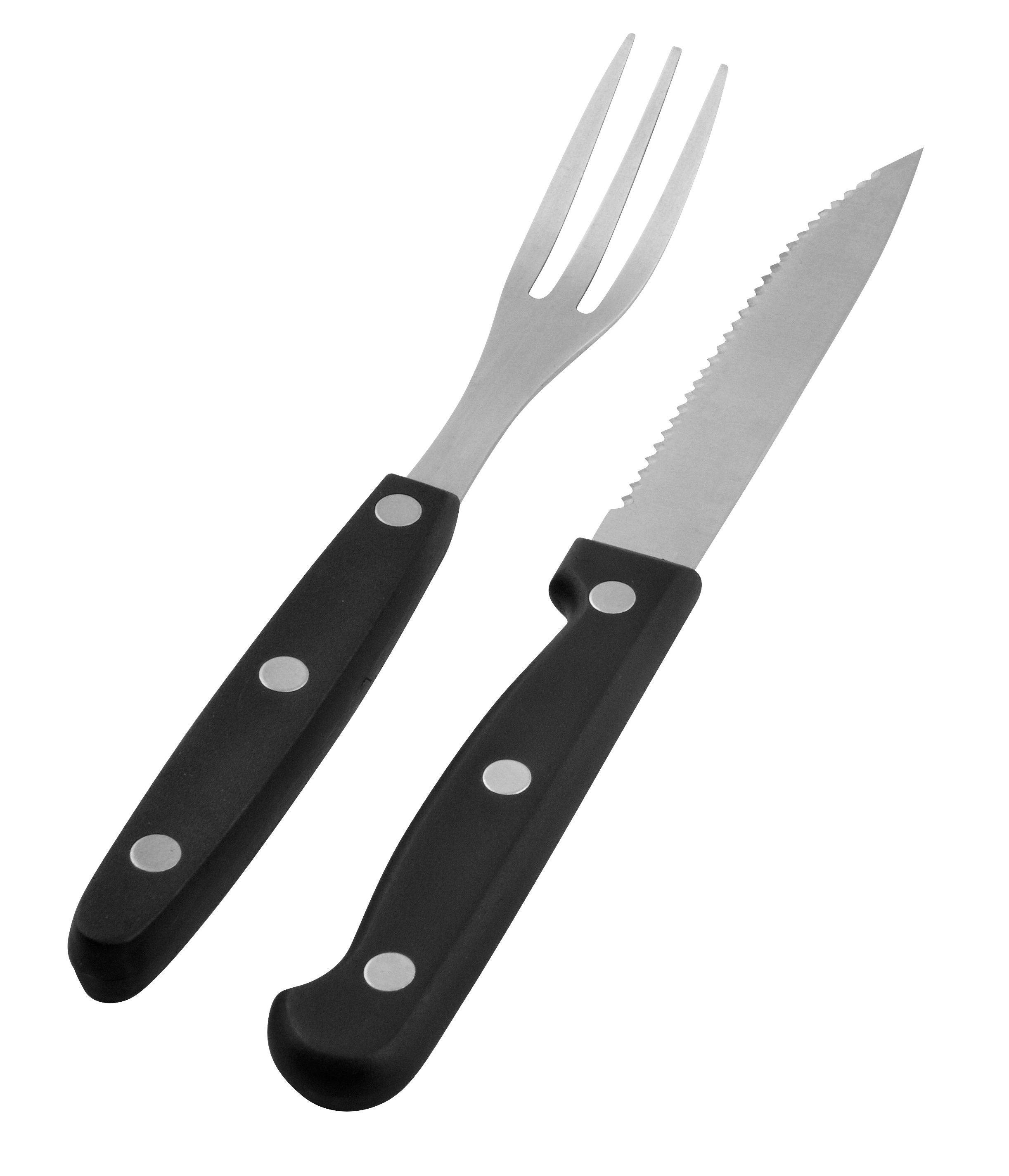Goditi la bistecca al massimo con il set di posate da bistecca da 8 pezzi! Questo set è composto da un coltello da bistecca lungo 22 cm con una lama da 1,5 mm e una forchetta da bistecca lunga 20 cm con denti da 1,5 mm e manico nero.