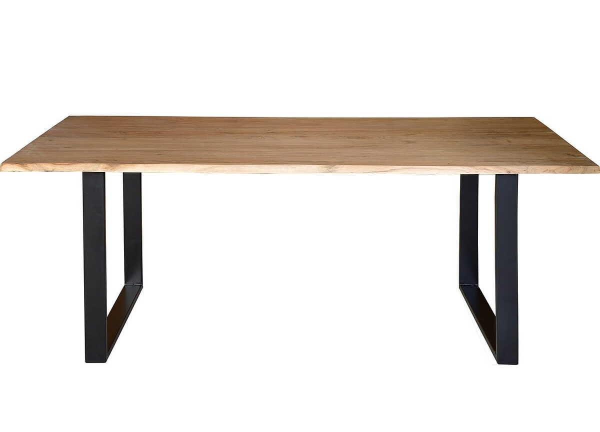 Tavolo da pranzo con piano in legno massiccio di acacia e gambe in ferro. Dimensioni delle gambe: 74 cm di altezza x 7,5 cm di larghezza x 2,5 cm di profondità. Spessore delle gambe: 2,6 cm. Il prodotto viene consegnato smontato. Attrezzi di montaggio inclusi.