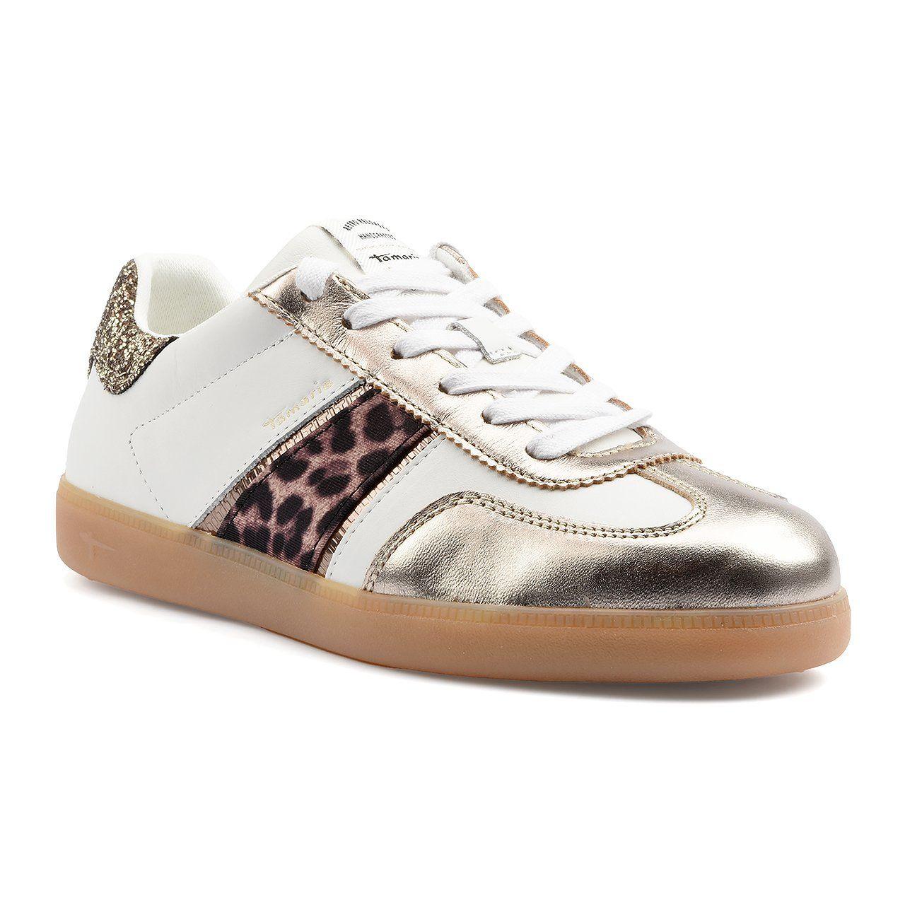 Queste sneakers basse sono un must-have per le appassionate di moda. Queste scarpe trendy e femminili combinano eleganza e comfort per un'esperienza di calzata unica. La tomaia è realizzata in pelle bianca lucida e tessuto sintetico metallizzato, con una striscia di stampa pantera nera che aggiunge un tocco audace al design. I lacci bianchi passano attraverso anelli argentati, mentre la linguetta posteriore è adornata con materiale scintillante. Le suole in gomma sono resistenti e offrono una buona aderenza. Queste sneakers basse sono ideali per passeggiate, uscite di piacere o semplicemente per completare gli outfit di tutti i giorni. Con il loro stile versatile e il comfort garantito, sono una scelta essenziale per le donne che vogliono rimanere alla moda pur rimanendo comode.