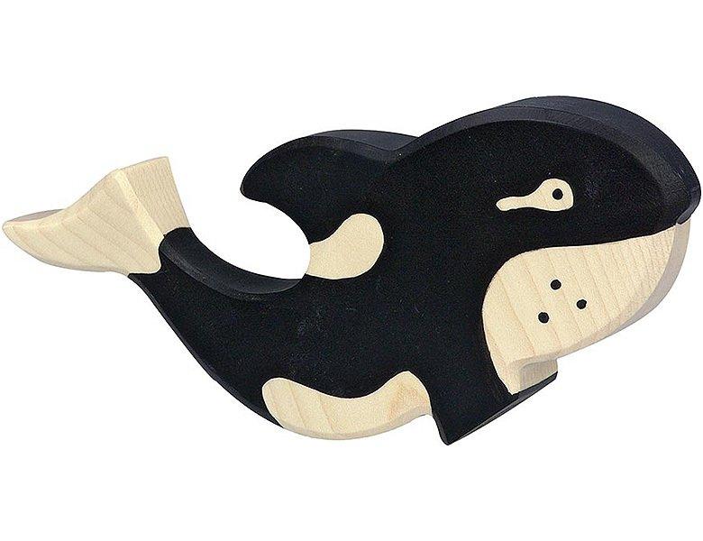 Die Holzfigur des Orka-Wals misst 16,5 x 2,8 x 8 cm und wird aus massivem Ahorn- und Buchenholz in Europa handgefertigt. Sie ist sanft abgerundet und mit ungiftigen Farben auf Wasserbasis bemalt, was sie besonders langlebig und kinderfreundlich macht.