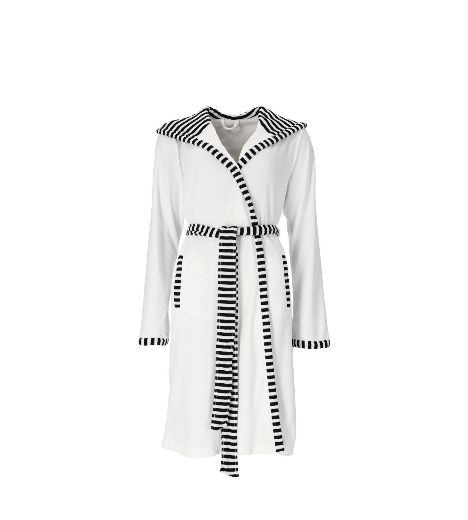 L'accappatoio Juno offre comfort e stile, perfetto per rilassarsi a casa. Presenta una texture morbida e un design classico con cappuccio per maggiore calore e comfort. I dettagli a righe sul cappuccio, sui polsini e sulla cintura a nodo aggiungono un tocco di eleganza moderna a questo capo essenziale per il loungewear.