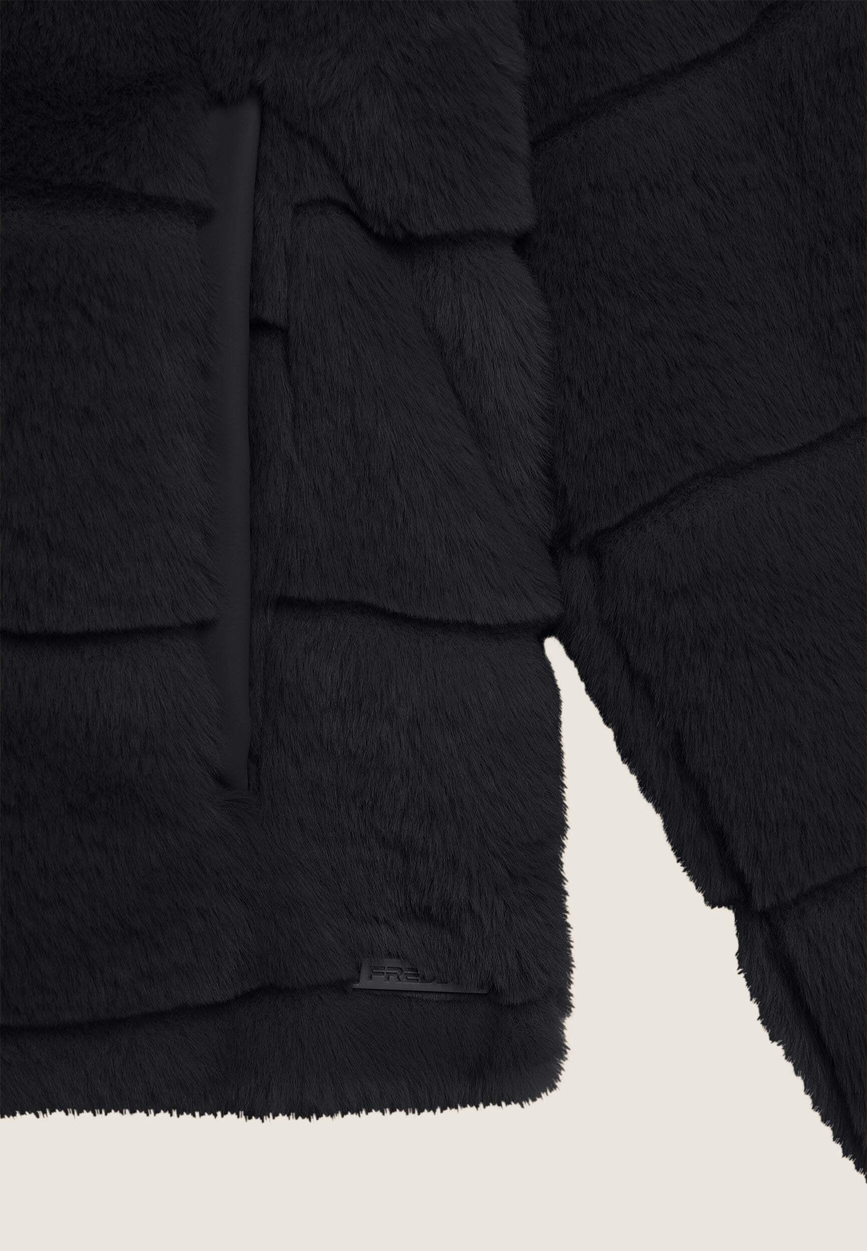 Questa giacca con cappuccio è realizzata in pelliccia sintetica tagliata al laser e presenta un sorprendente design a righe. Il cappuccio offre una protezione aggiuntiva contro il freddo, mentre la cerniera assicura una vestibilità comoda e pratica. Le tasche invisibili, abilmente integrate lungo le cuciture dei fianchi, offrono spazio per gli oggetti essenziali senza compromettere il look. La fodera interna offre comfort e calore extra.