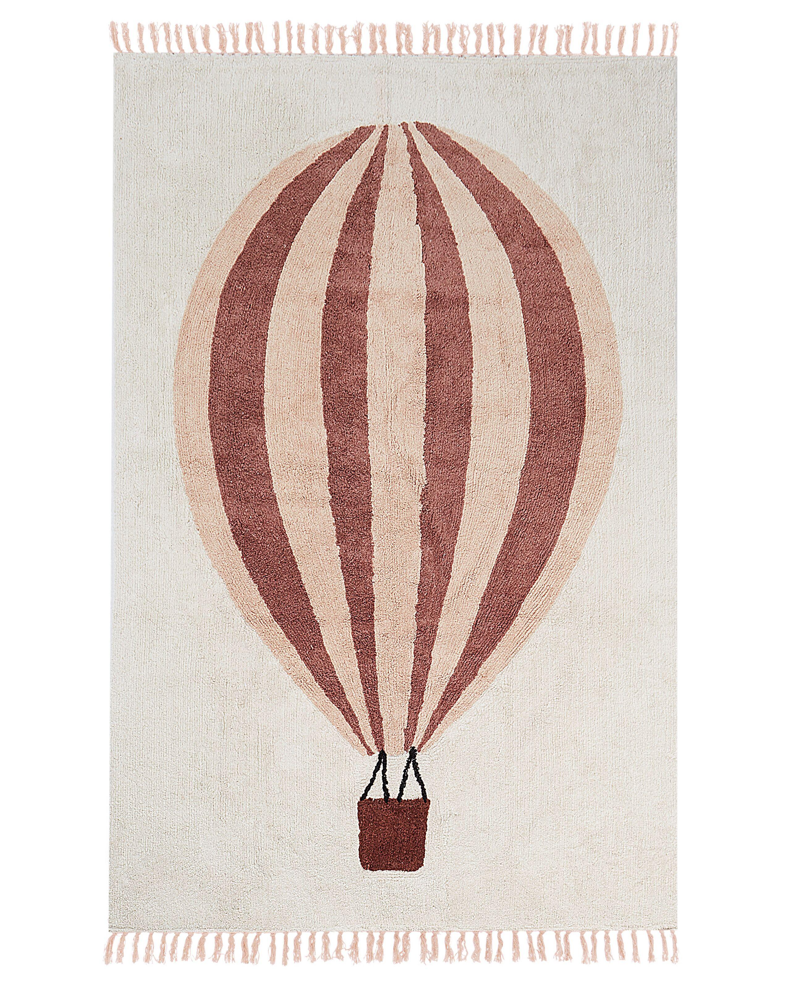 Tappeto rettangolare con motivo mongolfiera. Questo tappeto in cotone lavorato a mano e trapuntato sarà una scelta perfetta se stai cercando qualcosa di speciale per i tuoi spazi domestici. Il suo colore bianco sporco si adatta facilmente a qualsiasi stile di arredamento. Inoltre, il motivo colorato della mongolfiera rende i ogni ambiente ancora più unico. Può essere perfetto sia per la camera dei bambini che per il soggiorno.