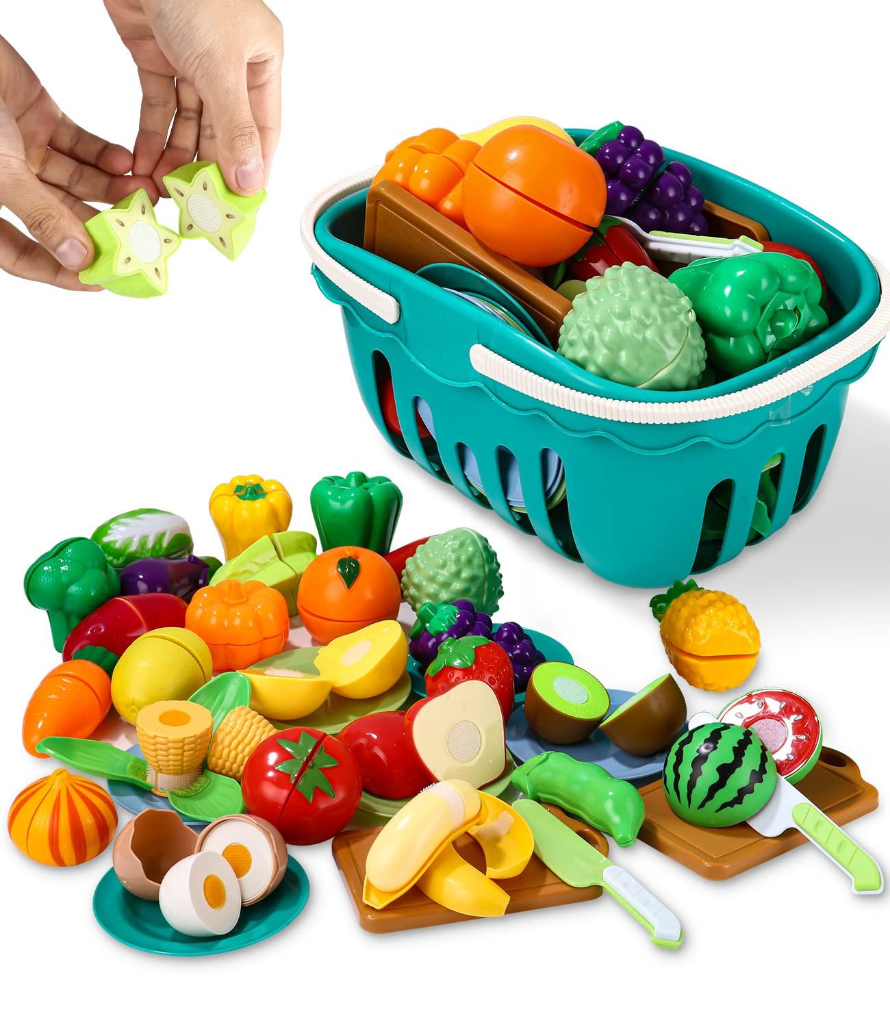 Activity-board, Spielküchenzubehör, Kinderküchenzubehör, Plastikobst zum Schneiden, verschiedene Obst- und Gemüsesorten, Teller, Schneidebretter