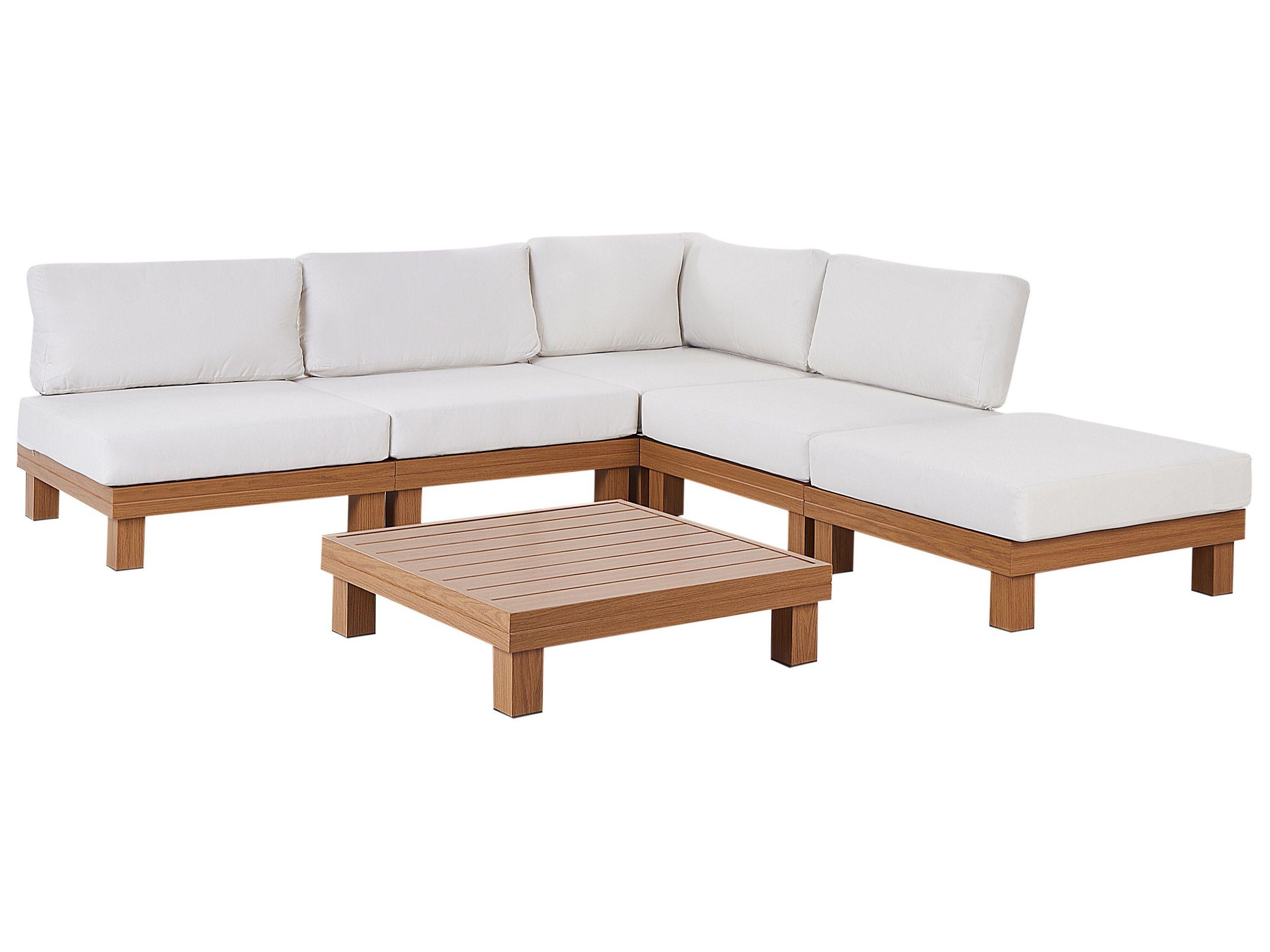 Divano angolare da esterno con tavolo. Rilassati con stile con questo set da salotto per esterni a 5 posti. La solida struttura in alluminio con un realistico effetto legno combina estetica naturale e praticità, garantendo una lunga durata senza bisogno di complicate manutenzioni. La verniciatura a polvere e la finitura a trasferimento termico assicurano una cura senza sforzo, con una semplice pulizia ad acqua. La leggerezza degli elementi rende facile lo spostamento dei componenti modulari, consentendoti di creare con facilità la disposizione perfetta per il relax o l'intrattenimento.