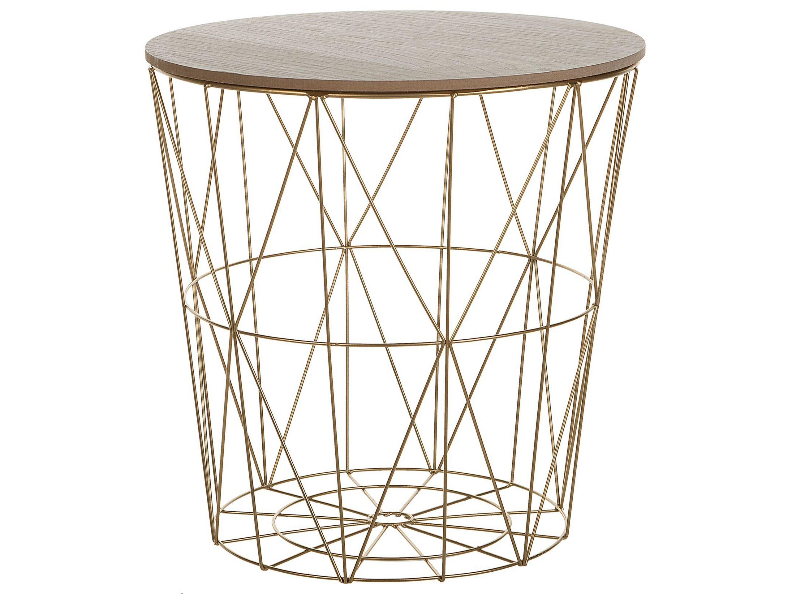 Tavolino contenitore in filo metallico. Un tavolino moderno e versatile, perfetto per camera da letto o la zona giorno. Caratterizzato da un telaio in filo d'oro, con un coperchio rimovibile in una tonalità di legno chiaro. Il design del tavolo offre spazio extra per coperte, libri e altri oggetti.