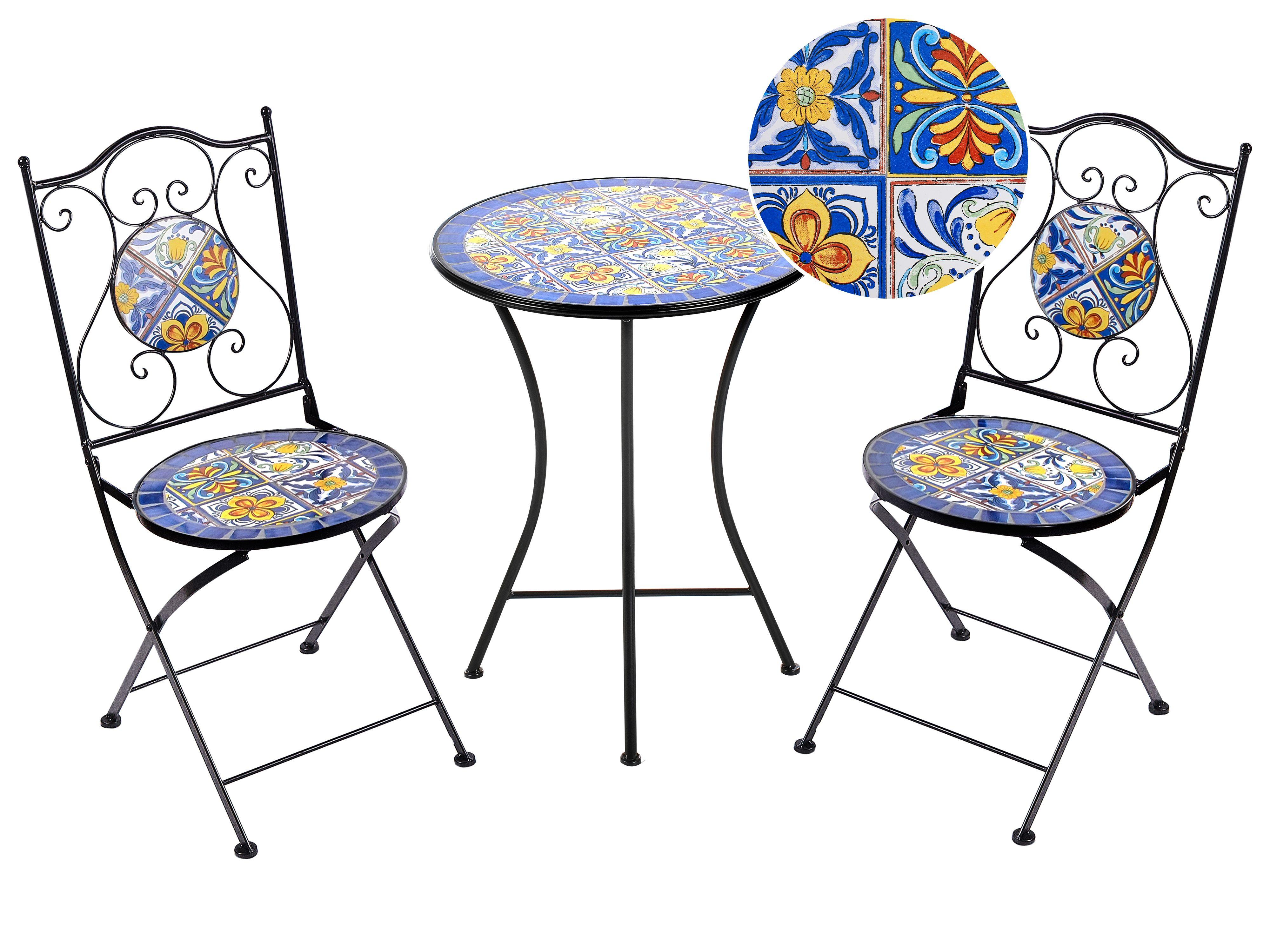 Set da giardino in stile vintage. Aggiungi un tocco di fascino vintage al tuo balcone, patio o giardino con questo elegante set da bistrot composto da un tavolo e due sedie pieghevoli. Realizzati in metallo resistente e trattati con un rivestimento e coating una speciale finitura elettrostatica che aiuta a prevenire ruggine e corrosione ogni elemento è progettato per resistere agli agenti atmosferici mantenendo intatta la sua bellezza. Il vivace motivo in mosaico ceramico aggiunge un tocco artistico unendo funzionalità e valore decorativo. Facile da mantenere e resistente alle intemperie questo set è perfetto per goderti il caffè del mattino o condividere una serata romantica all’aperto.