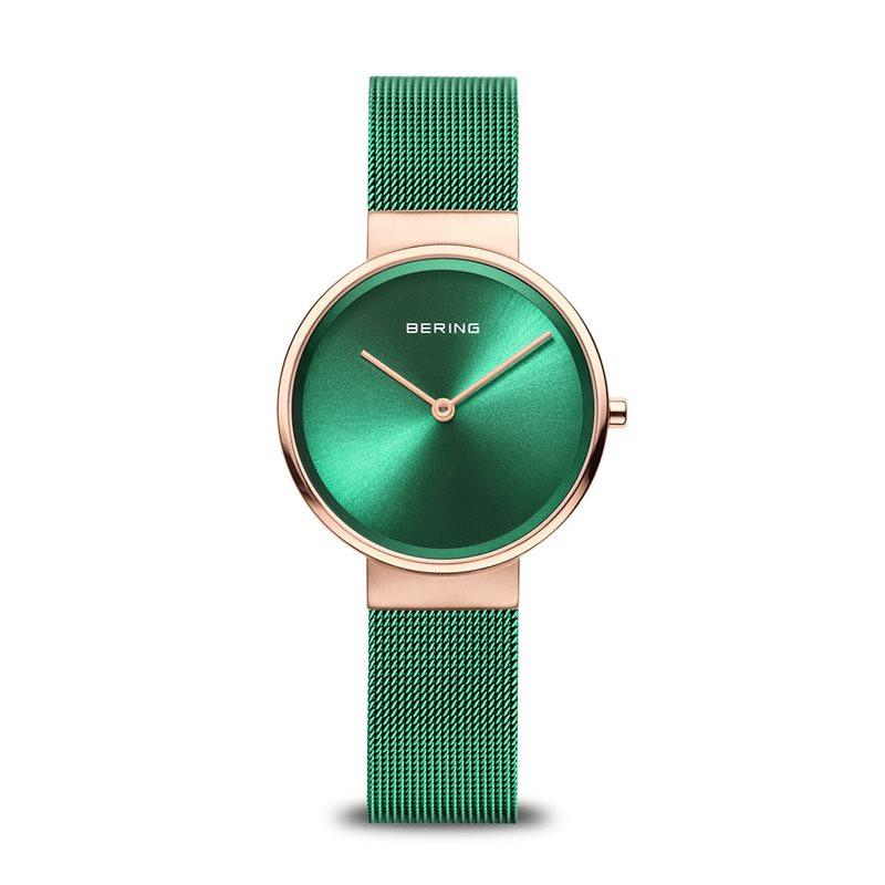 Im Mittelpunkt dieses Kunstwerks steht das für BERING charakteristische puristische Design. Klare Linien und eine reduzierte Formensprache bestimmen den Stil dieser außergewöhnlichen Uhr. Sie ist nicht nur ein Instrument zur Zeitmessung, sondern ein Kunstwerk, das Understatement und auffallende Eleganz meisterhaft vereint. Das Geheimnis ihrer Langlebigkeit und Schönheit liegt in der Verwendung hochwertiger Materialien. Das Gehäuse aus fein gebürstetem und poliertem Edelstahl in strahlendem Gold verleiht der Uhr eine luxuriöse und doch zurückhaltende Ausstrahlung. Die Kombination von Gold und Grün sorgt nicht nur für eine glänzende Optik, sondern auch für Robustheit und Langlebigkeit.