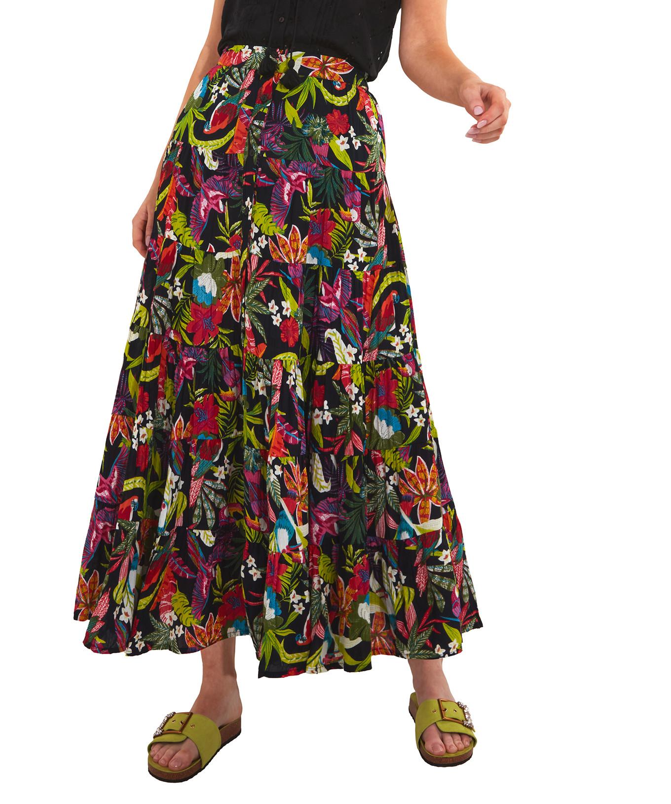 Questa gonna lunga a balze presenta una vivace stampa tropicale all-over e un elastico in vita sul retro. Il suo design fluido garantisce comfort e una silhouette elegante.