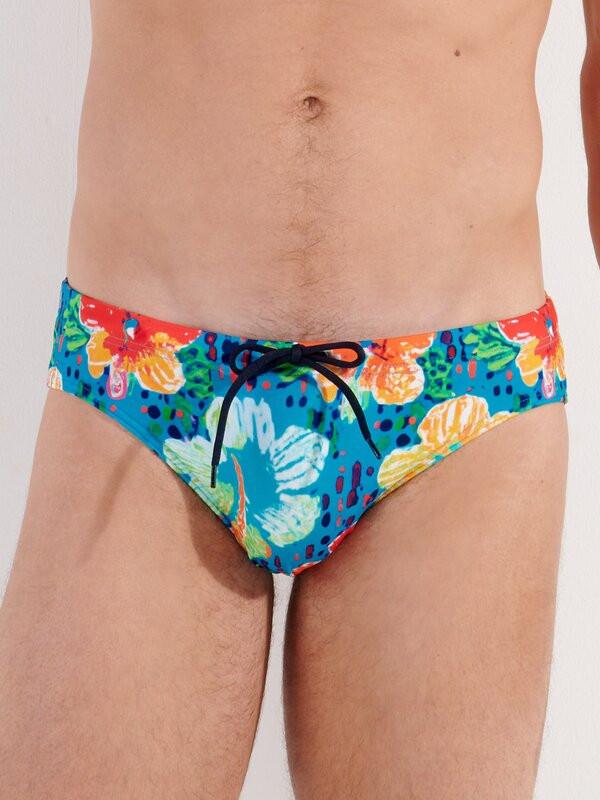 Questo slip da bagno presenta una stampa vivace e colorata, decorata con grandi fiori esotici. La cintura a tunnel elasticizzata con coulisse all'esterno garantisce una vestibilità regolabile e sicura. La parte anteriore è comodamente doppiata per un supporto ottimale e libertà di movimento.