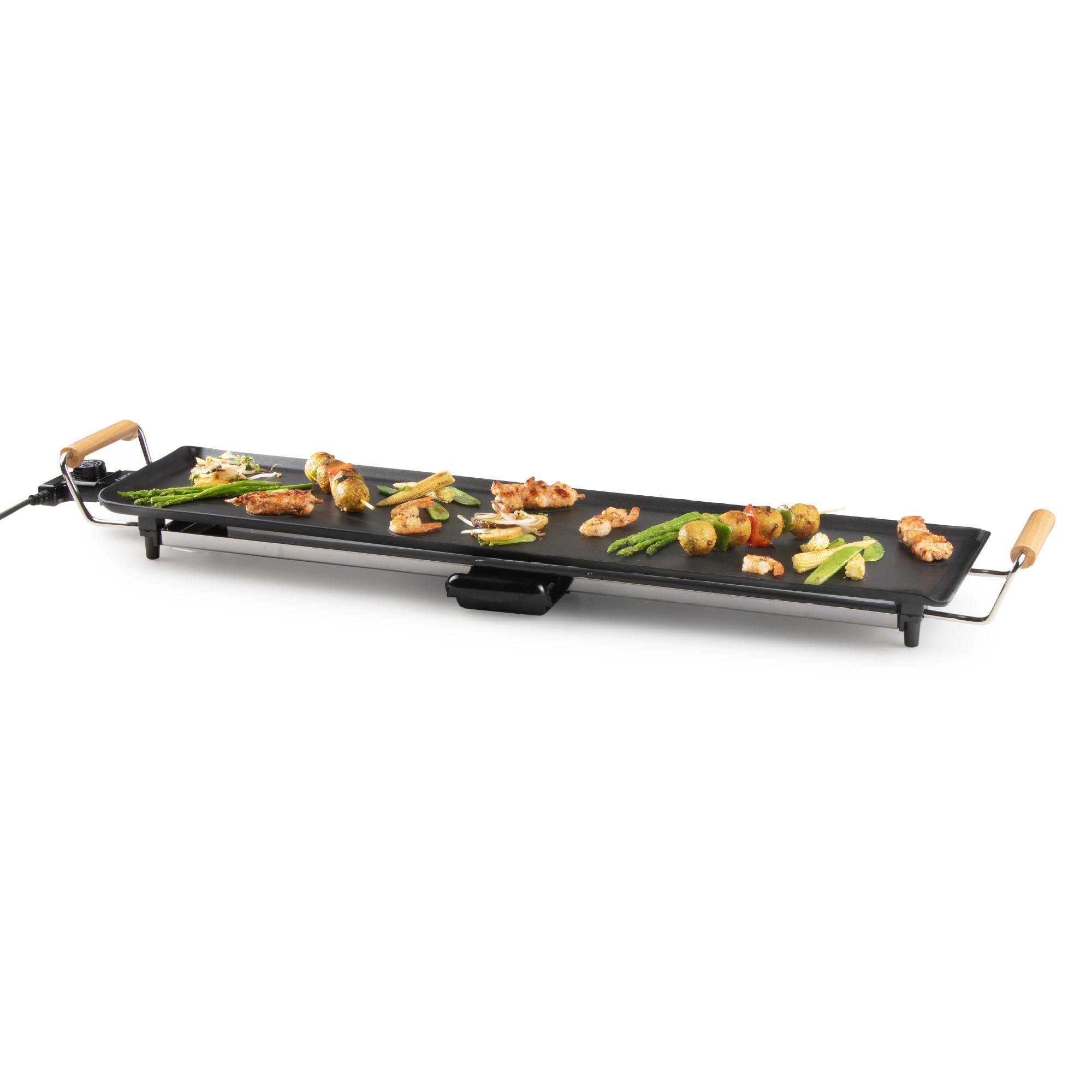 La griglia da tavolo Teppanyaki XXL DO8313TP di Domo porta il piacere delle grigliate asiatiche direttamente a casa vostra. casa, ideale per la socializzazione con la famiglia o con gli amici. La superficie di grigliata extra-large e il design ben studiato rendono rendere le grigliate in compagnia un piacere senza complicazioni.Superficie di frittura con rivestimento antiaderente: 90 × 22 cmSpina termostatica rimovibile e regolabile con indicatore luminosoCassetto di raccolta per il grasso in eccessoManiglie cool-touch in look legnoPotenza: 1800 wattCon la sua superficie di grigliatura lunga 90 cm la griglia teppanyaki offre molto spazio per carne, pesce, verdure o tofu, pesce, verdure o tofu, perfetto per friggere più ingredienti contemporaneamente. ingredienti allo stesso tempo. Il rivestimento antiaderente garantisce un'agevole rotazione e una facile pulizia. facile pulizia, mentre il termostato rimovibile permette di controllo preciso della temperatura. Il cassetto laterale raccoglie il grasso in eccesso per una grigliata pulita. esperienza di grigliata. Grazie alle maniglie resistenti al calore in un elegante maniglie in legno, il grill può essere spostato in tutta sicurezza anche durante il funzionamento. Ideale per uso interno ed esterno.