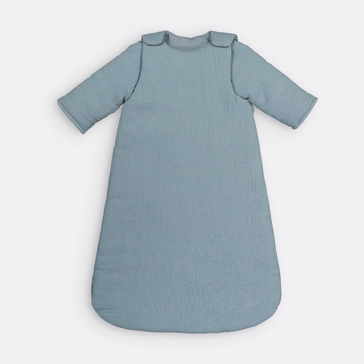 Il sacco nanna Kumla in garza di cotone è ideale per la mezza stagione, sostituendo la coperta e mantenendo il bambino al caldo durante il sonno. Le sue maniche lunghe sono rimovibili con bottoni a pressione per adattarsi alle diverse temperature.