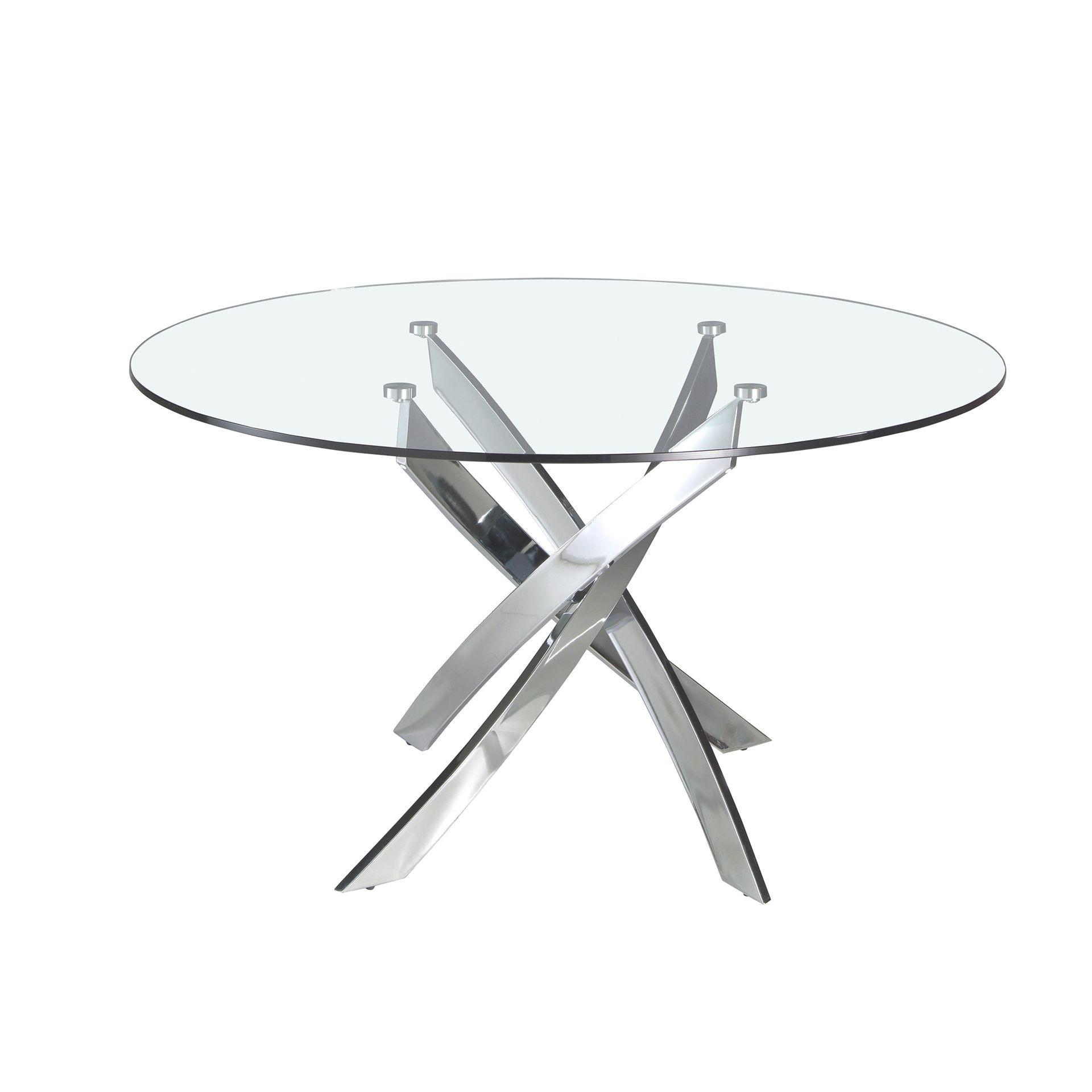 Tavolo da pranzo rotondo di design moderno con piano fisso in vetro temperato. Le sue originali gambe in acciaio inox cromato sono elementi chiave per evidenziare il suo design.