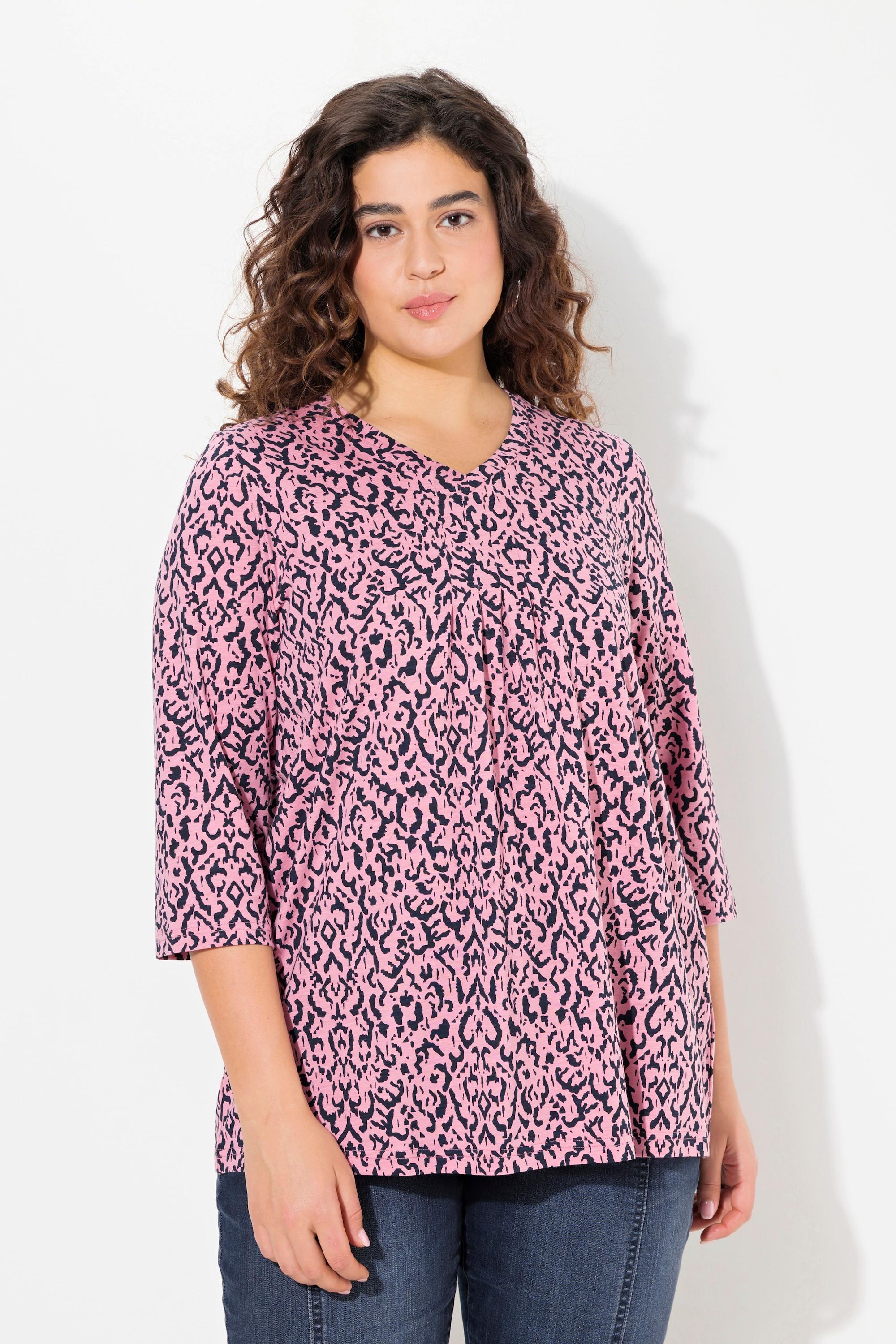 Questa maglia dal taglio svasato è realizzata in morbido jersey di cotone con una texture fine e una stampa all-over. Presenta uno scollo a V con tre pieghe decorative e comode maniche a 3/4. Il taglio svasato offre un orlo comodamente ampio.