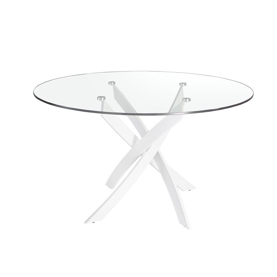 Tavolo da pranzo rotondo moderno con piano fisso in vetro temperato. Le sue originali gambe in acciaio verniciato bianco sono elementi chiave per evidenziare il suo design.