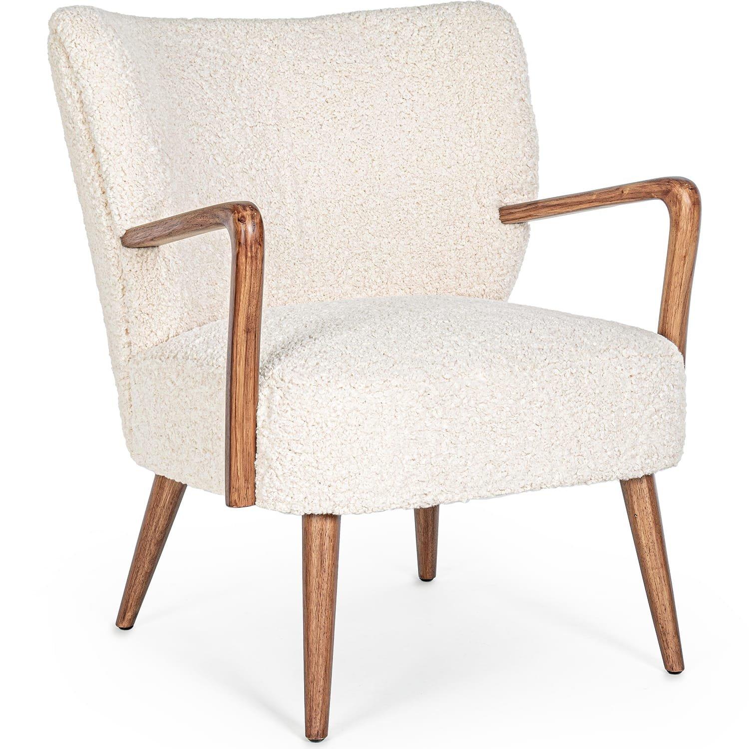 Poltrona Moritz White, struttura in legno di pino e compensato. Gambe in legno di gomma. Rivestimento in poliestere con aspetto di lana. Imbottitura in schiuma PU. Densità 24 kg/M3. Non sfoderabile. Gambe da assemblare.