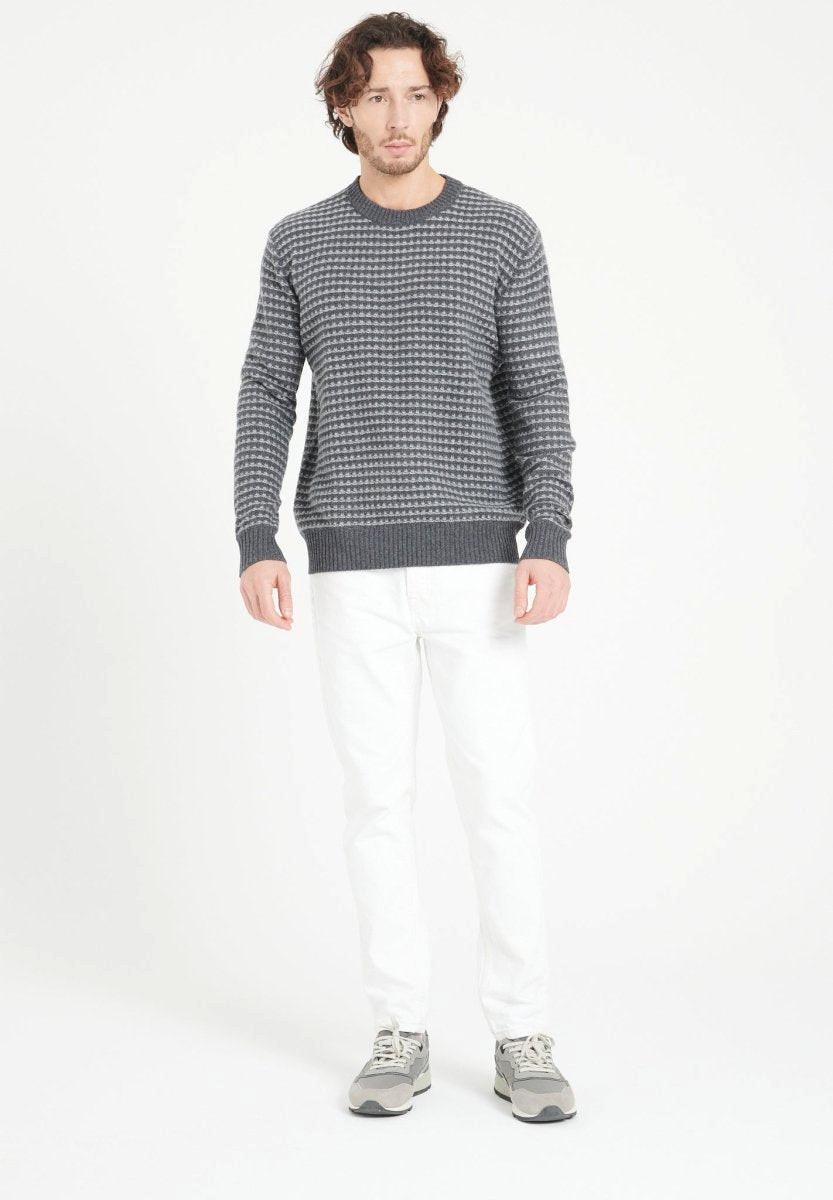 Questo maglione girocollo a 4 fili è realizzato in cashmere morbido e caldo, con un originale motivo jacquard. Presenta una vestibilità rilassata e finiture a costine. Questo capo versatile può essere indossato con jeans o pantaloni sartoriali.