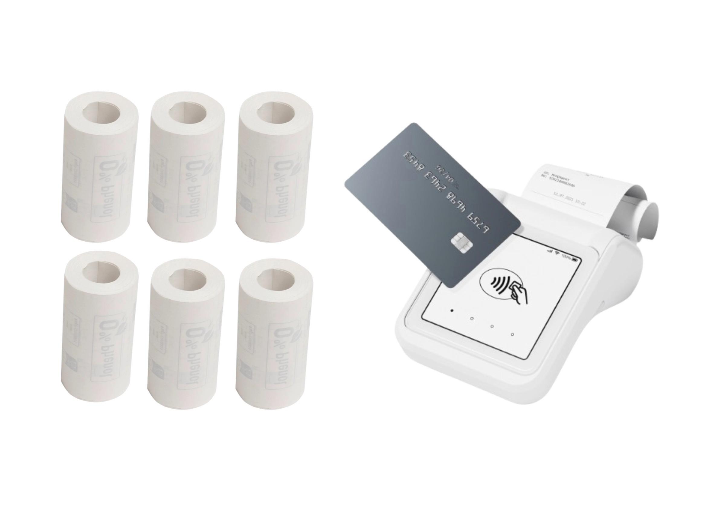 - 6 rotoli di carta per stampante (dimensioni 57 mm di larghezza, rotolo lungo max 10 m (diametro totale max 30 mm), diametro interno rotolo di cartone 12 mm)