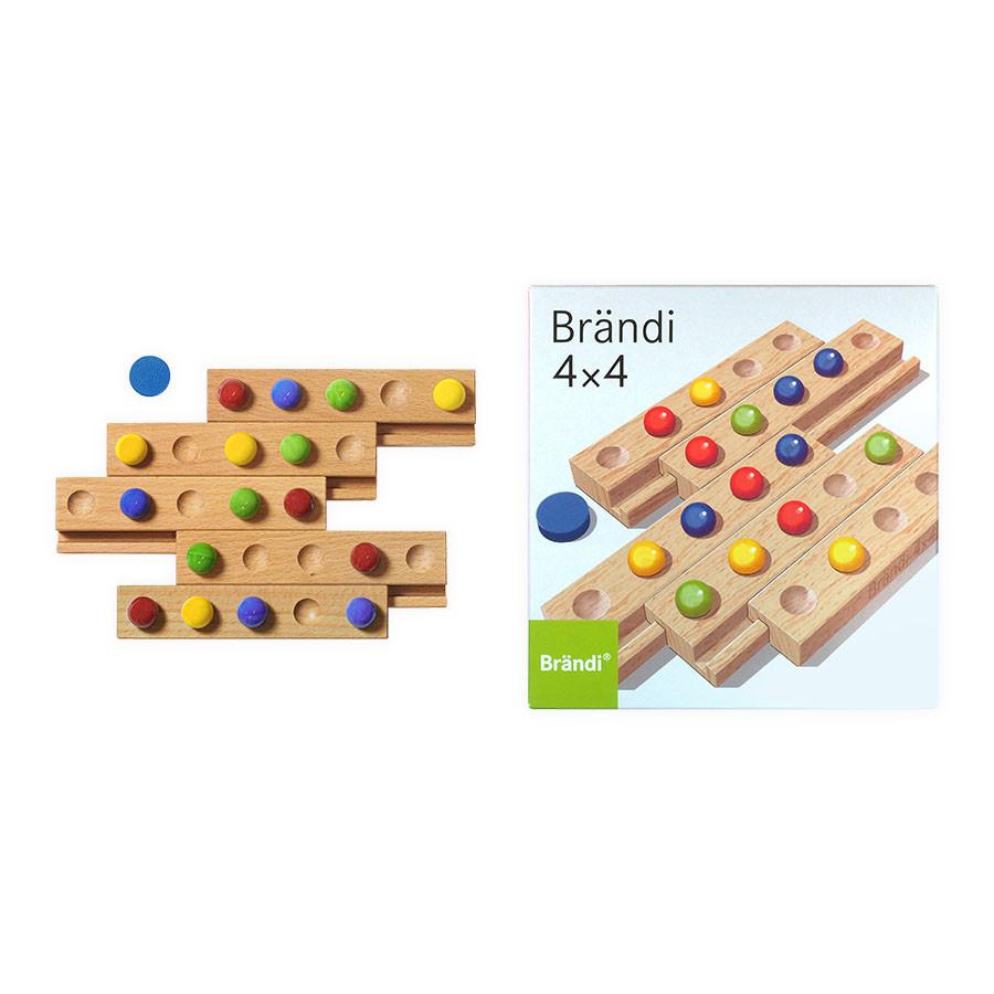 Brändi 4x4 è il nome del gioco di Brändi in cui il numero 4 è protagonista. Posizionare, far scorrere e combinare. Il primo giocatore che forma una linea con quattro biglie del proprio colore vince la partita. La linea può essere orizzontale, verticale o diagonale. Il gioco ideale per le situazioni intermedie.