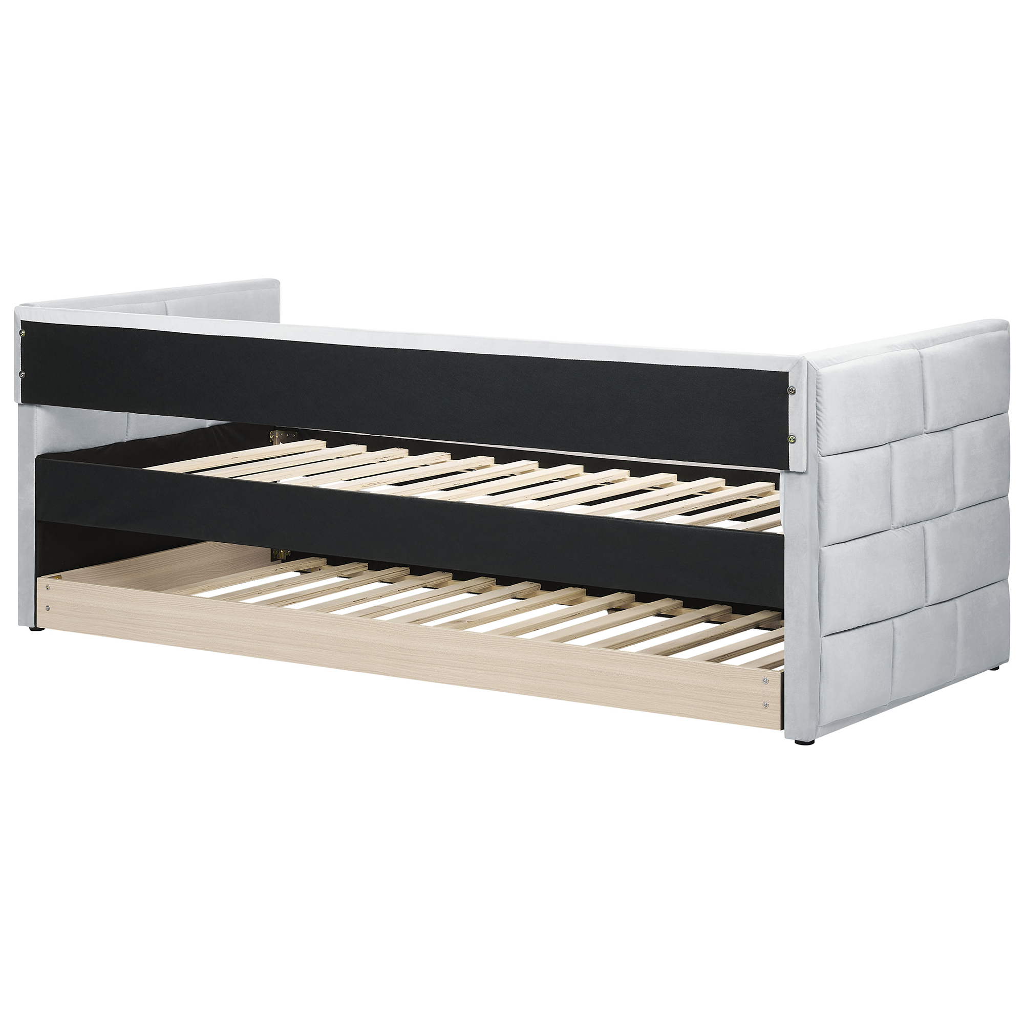 Letto dal design glamour. Questo raffinato letto è dotato di un telaio scorrevole, che offre un comodo letto extra quando necessario. La tappezzeria decorata con un elegante motivo in velluto morbido e liscio aggiunge un tocco di fascino glamour a qualsiasi stanza. Ideale sia per le camere dei bambini che per le stanze degli adulti, questo letto con un extra letto a scomparsa combina stile e praticità, assicurando un riposo notturno confortevole e massimizzando l'efficienza dello spazio.