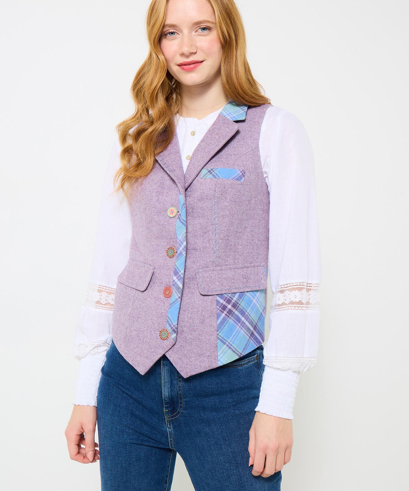 Con l'aspetto patchwork e i dettagli a contrasto, ti farai notare in questo gilet di tweed.