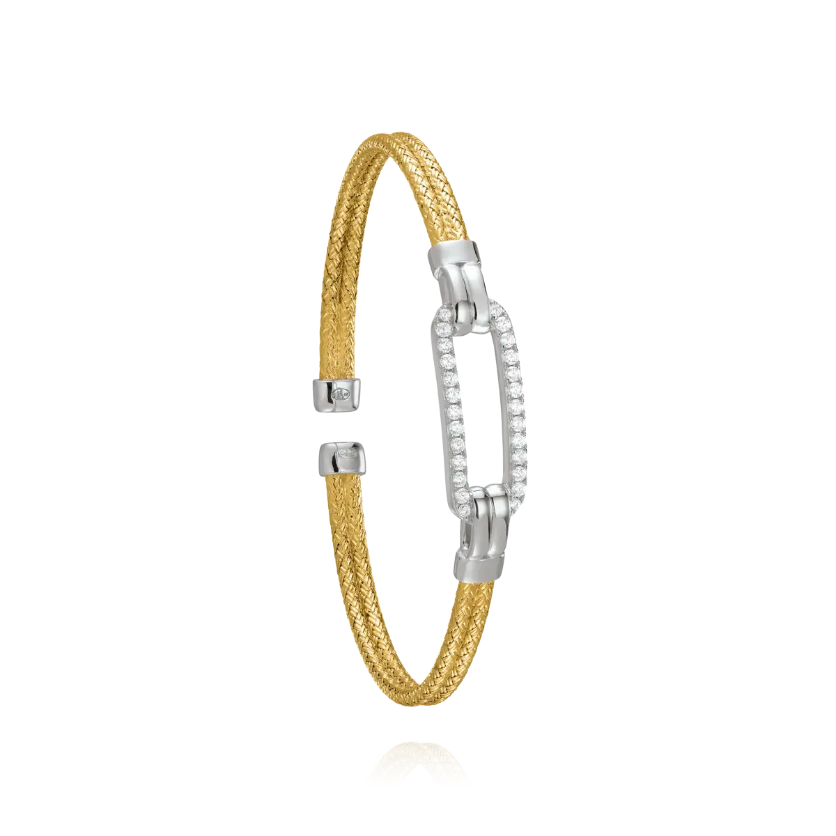 Questo bracciale rigido presenta un doppio intreccio in argento 925 dorato completato da una maglia in argento rodiato incastonata con ossidi di zirconio. Questo braccialetto è aperto per adattarsi a entrambi i polsi.