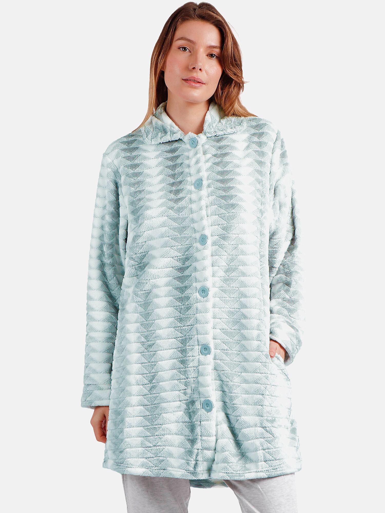 Questa giacca da interno Admas è realizzata in un caldissimo pile Corel, il cui tessuto è strutturato con motivi geometrici a triangoli. Morbidissima e confortevole, è ideale da indossare in casa nelle serate autunnali e invernali. La giacca presenta maniche lunghe, tasche laterali e una chiusura frontale con bottoni. Il tessuto è morbido al tatto.