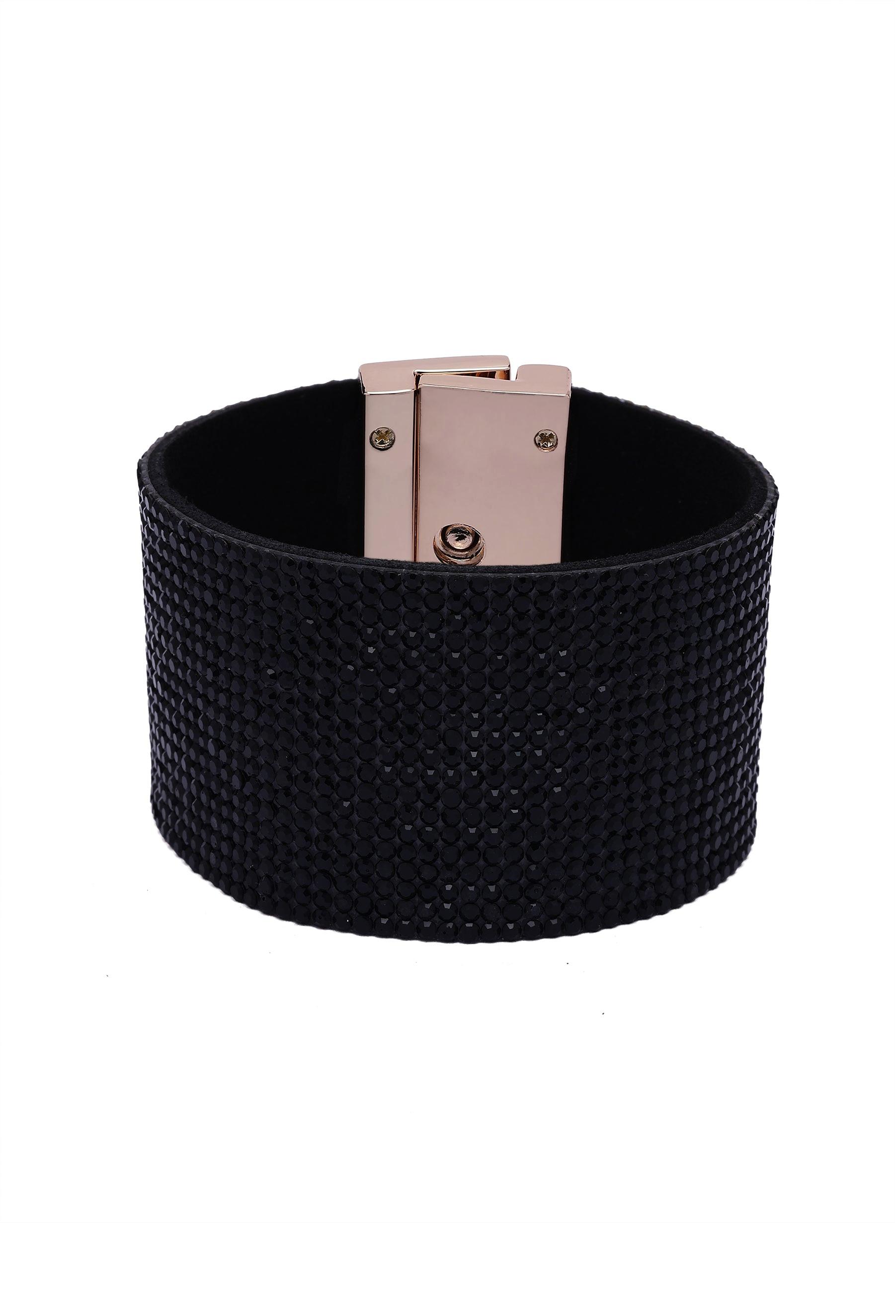 Avvolgi il tuo polso con pura energia da diva. Questo ampio bracciale in pelle è ricoperto di cristalli neri, creando un luccichio nero corvino che ricorda quello di un red carpet. Foderato in morbida pelle scamosciata e rifinito con un'elegante chiusura lucida, è un pezzo audace e lussuoso per le serate in cui vuoi che tutti gli occhi siano puntati su di te. Dimensioni: Diametro 6,5 cm, Lunghezza 20 cm, Larghezza 4 cm | Placcatura: Placcato oro | Chiusura: Fibbia magnetica