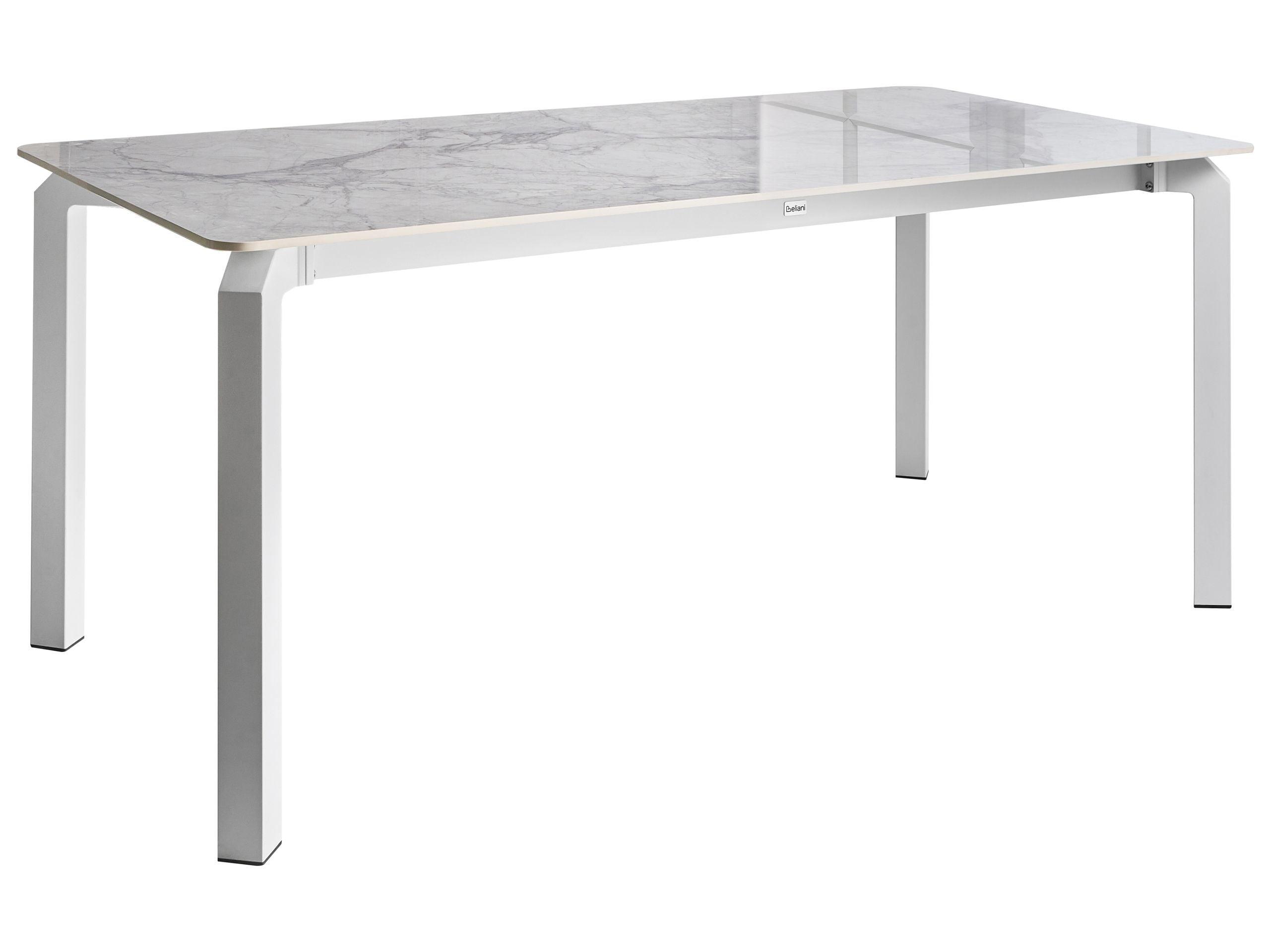 Tavolo da pranzo per uso esterno e interno. Questo tavolo da pranzo è la scelta ideale sia per ambienti interni che esterni, progettato per adattarsi alla vita quotidiana. Il piano in pietra sinterizzata, resistente e con finitura opaca e raffinato effetto marmo, aggiunge un tocco di eleganza, mentre le gambe in metallo assicurano un sostegno stabile e affidabile. Resistente ai raggi UV, agli agenti atmosferici e alla ruggine, è una soluzione pratica che si integra armoniosamente in una vasta gamma di stili d’arredo.
