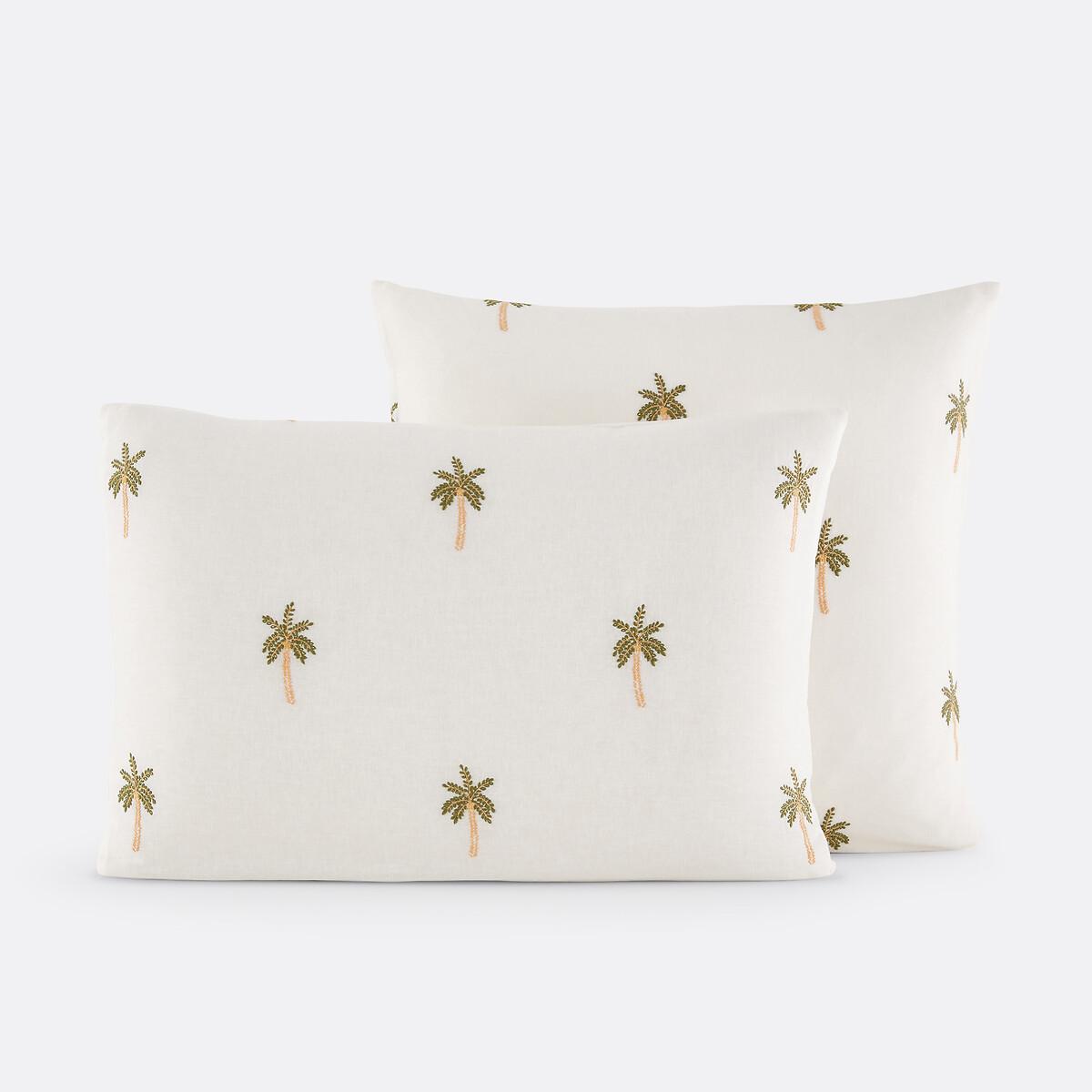 La biancheria da letto Ravenel, realizzata in cotone e lino, trasporta in un mondo pittoresco e incontaminato con ricami di palme stilizzate. Design di La Redoute Intérieurs.