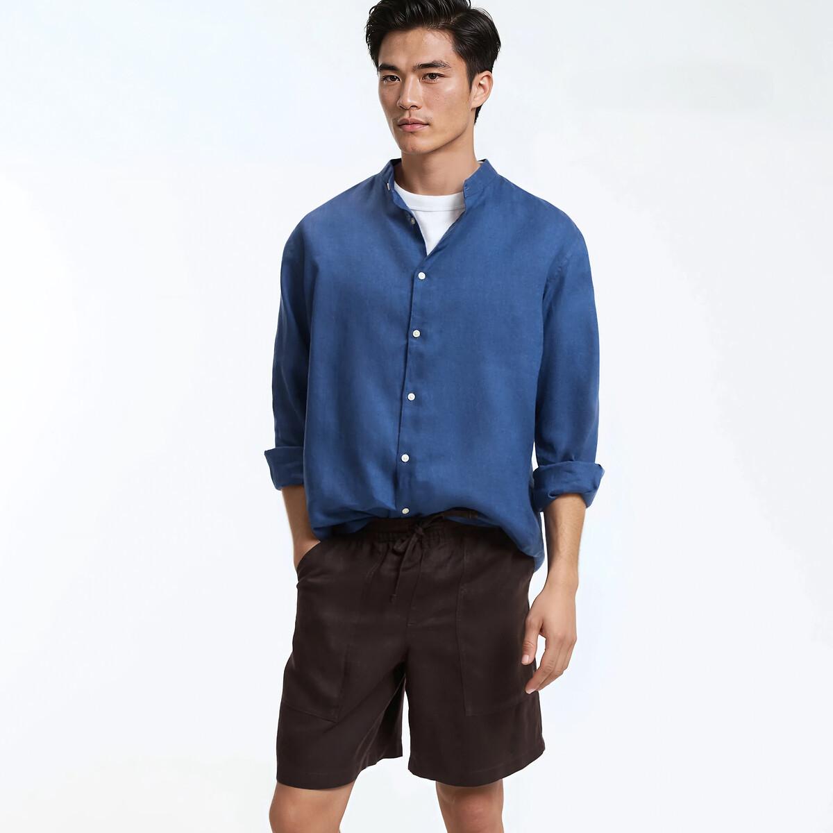 Questa camicia dritta in lino con un classico collo alla coreana è un'aggiunta intramontabile e versatile a qualsiasi guardaroba. Il design è adatto a varie occasioni, offrendo un'estetica raffinata ma rilassata.