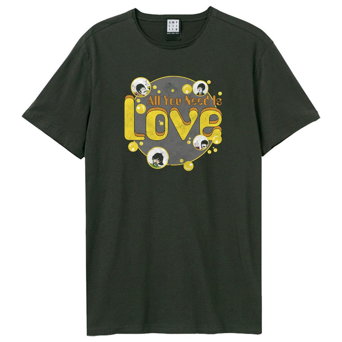 Questa T-shirt presenta un classico girocollo e maniche corte, offrendo una vestibilità comoda e versatile per l'uso quotidiano. La parte anteriore è adornata con una stampa grafica che include la frase "All You Need Is Love" e ritratti stilizzati dei Beatles, circondati da un giocoso design a bolle. Il tessuto è spazzolato per una sensazione morbida.