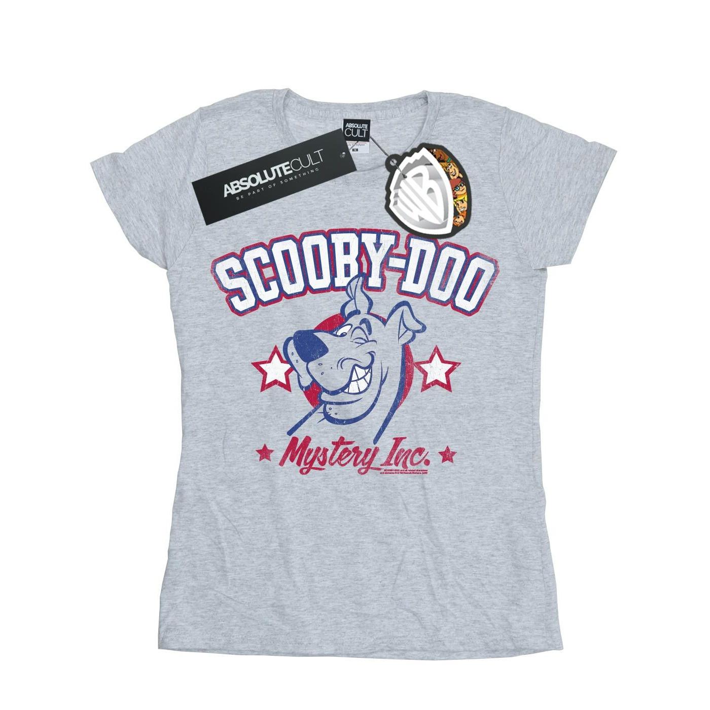 Questa T-shirt Collegiate presenta un classico girocollo e maniche corte, offrendo una vestibilità comoda e casuale. Il design mostra una grafica in stile invecchiato di Scooby-Doo con il testo "SCOOBY-DOO" e "Mystery Inc.", circondato da stelle, conferendogli un look universitario vintage.