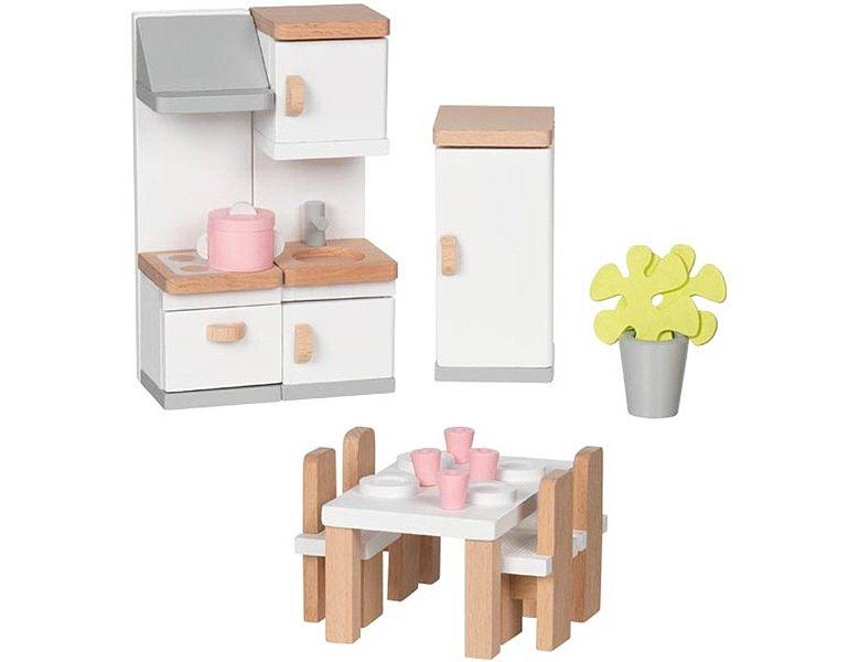 Elegantes Puppenmöbel-Set für die moderne Puppenhaus-Küche. Aus robustem Holz gefertigt, beinhaltet es eine Sitzgruppe, eine Küchenzeile mit verschiedenen Details und einen Kühlschrank. Ideal für kreative Rollenspiele.