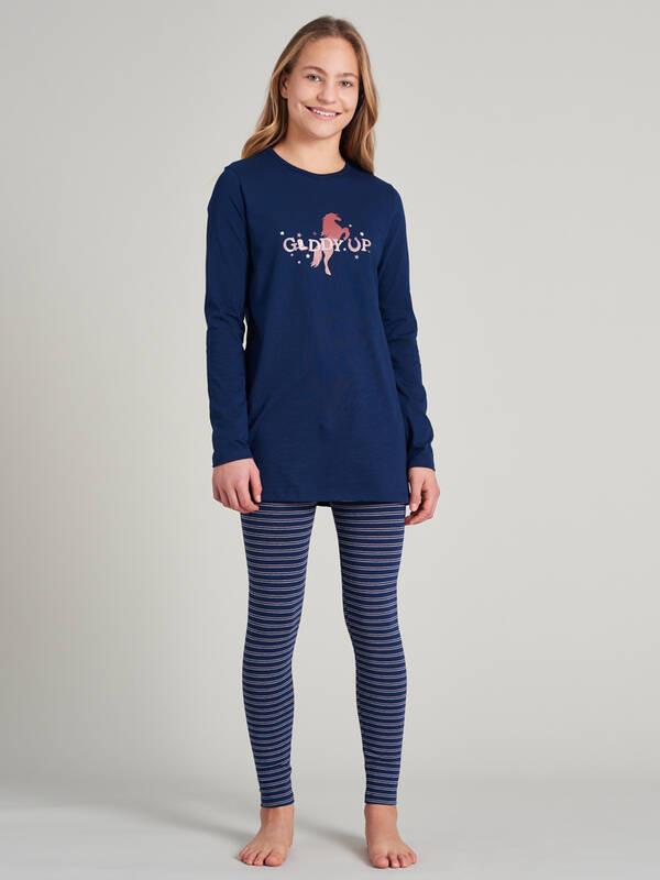 Top a maniche lunghe con scollo rotondo e taglio più lungo e alla moda con motivo di cavalli e scritta GIDDY UP con applicazioni di glitter
